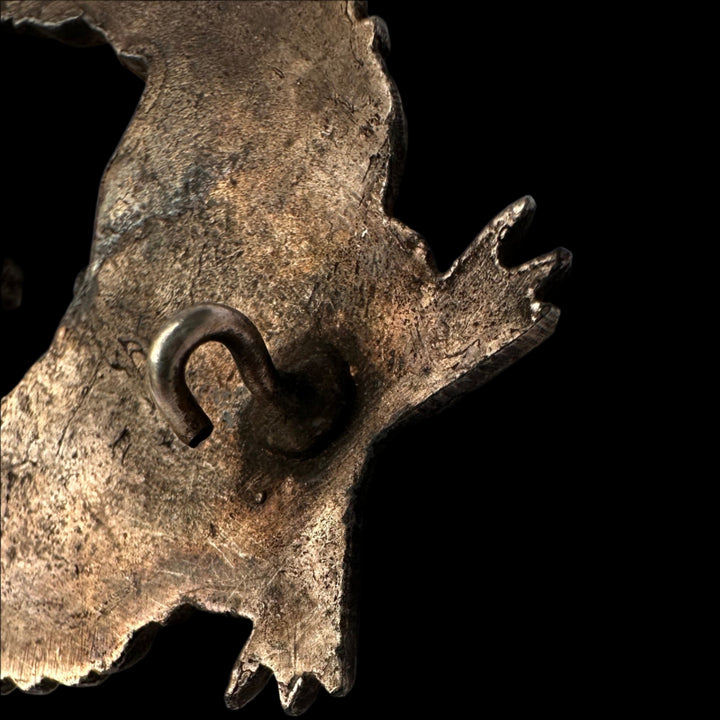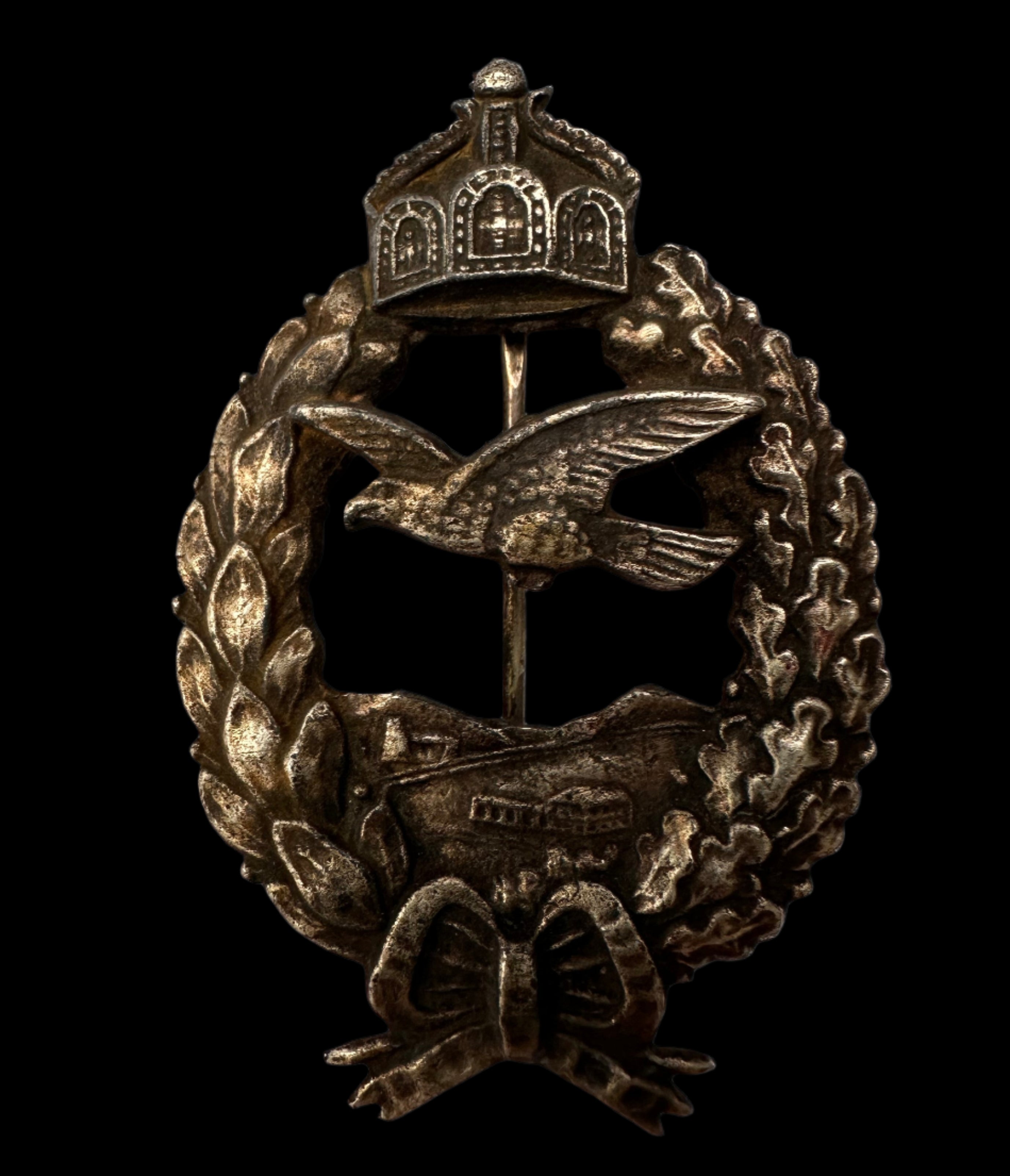 This is a scarce Imperial German Zeppelin Observer Badge — a privately purchased badge produced during the latter part of the First World War for airship personnel serving with the Army’s Zeppelin detachments. The obverse features an oval-shaped wreath composed of laurel (left) and oak (right) leaves, joined at the base with a bow, and surmounted by the Prussian royal crown. At the badge’s center, a Zeppelin floats over a stylized cityscape, while an eagle in full flight soars above — symbolizing the surveillance role of airship observers.