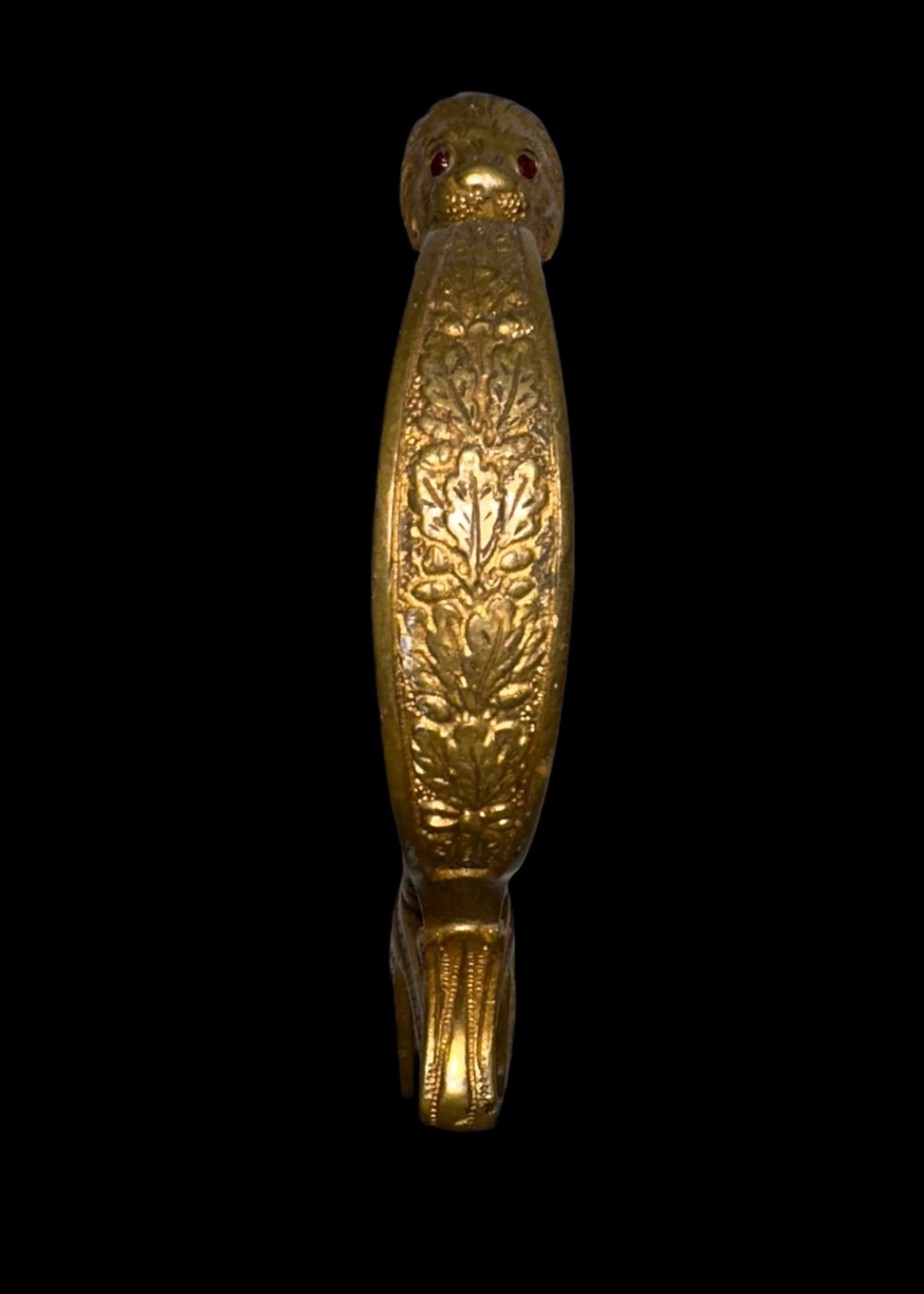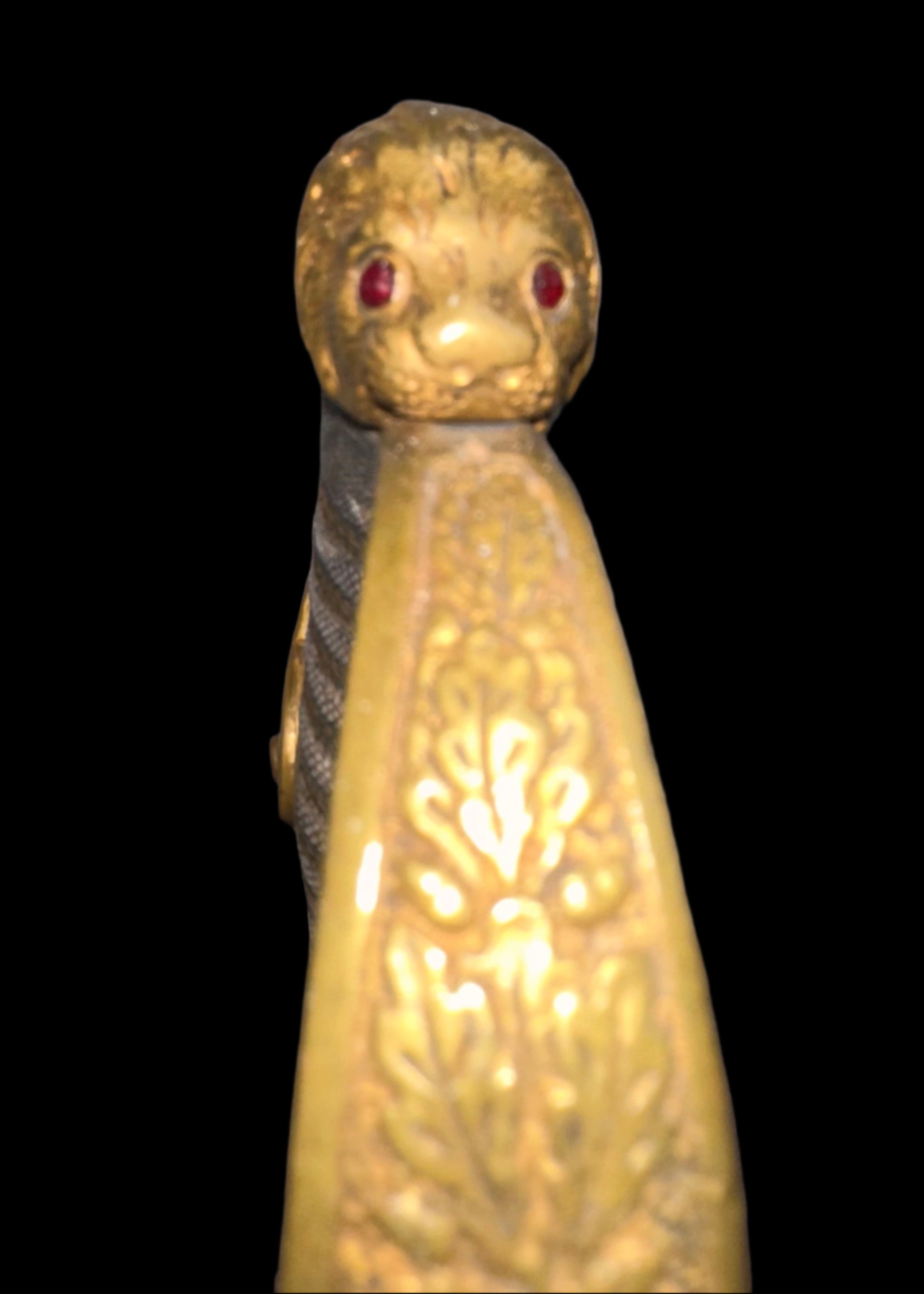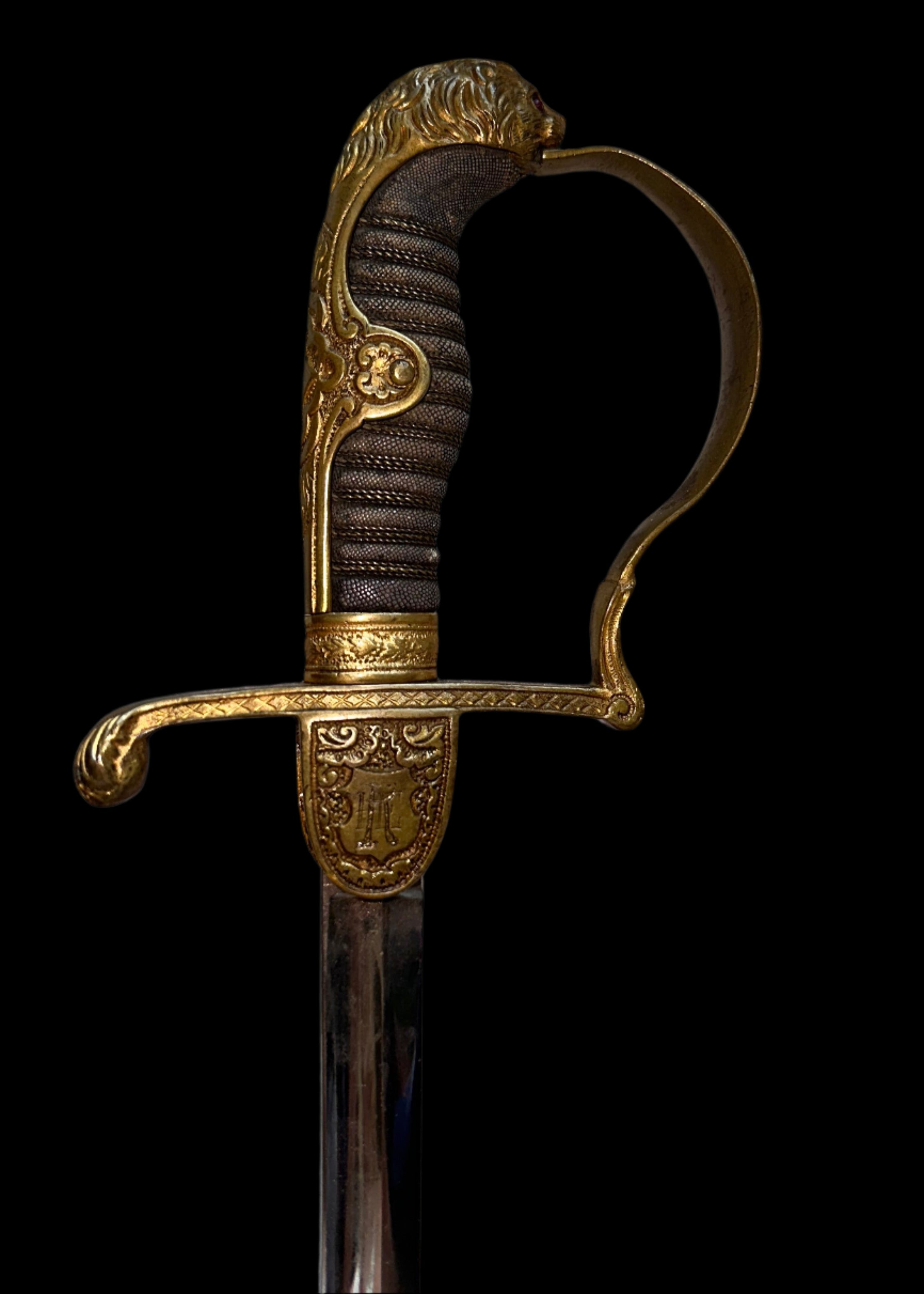 The hilt retains nearly all of its original fire gilding and displays elegant casting. The pommel is styled as a lion's mane, flowing down the backstrap in high relief—a unique stylistic departure from the more common lion-head pommels. The grip is tightly bound with fine copper wire over a black ray skin or leather base, now toned and slightly worn from age. -