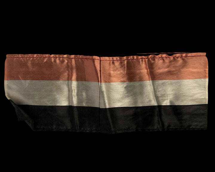 This is an authentic Imperial German tricolor silk armband, featuring the black, white, and red horizontal stripes of the national colors used during the German Empire (1871–1918). This particular piece would have been worn during patriotic events, parades, or public gatherings—either by veterans, nationalist groups, or civilian supporters during World War I. The combination of silk fabric and professionally finished interior backing suggests it was privately made rather than depot-issued, indicating possible use in formal or ceremonial settings rather than the battlefield.