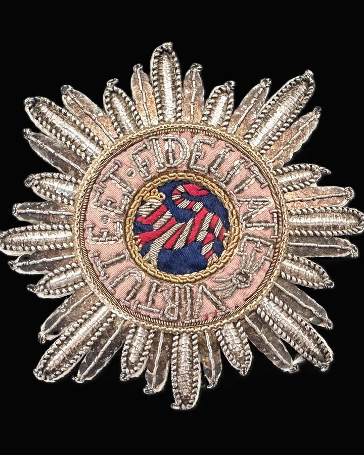 The medallion features a heraldic shield in vibrant red, blue, and white silk embroidery. The motto is encircled by finely stitched silver bullion thread, reflecting the precise craftsmanship typical of high-quality regalia from the late 19th to early 20th centuries. Surrounding the medallion is a stunning eight-pointed starburst, constructed with meticulously layered silver bullion threads, giving it an elegant three-dimensional effect.