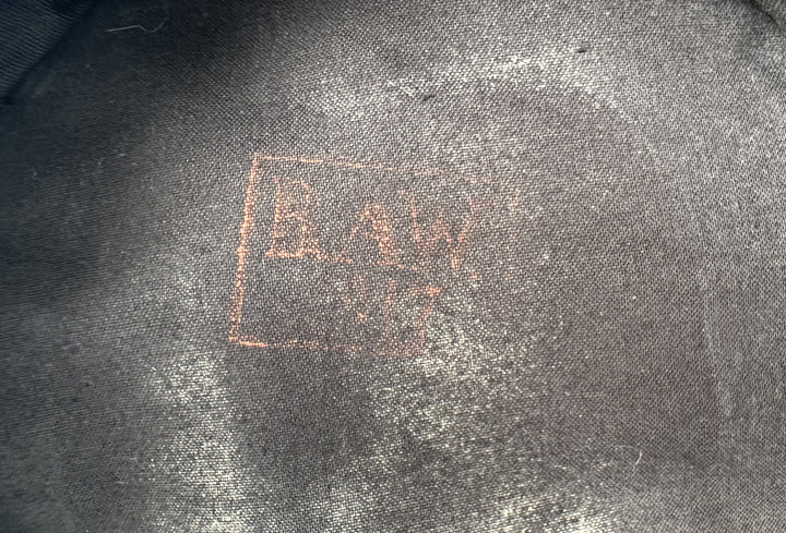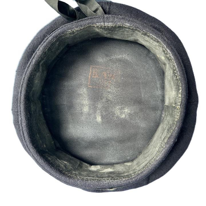 The cap’s front displays the traditional Imperial German cockade, featuring a red center surrounded by black and white, symbolizing the German Empire. Inside, the cap is lined with a worn but original fabric, stamped with the maker’s mark B.A.W. 1917, confirming its wartime production and authenticity. This well-preserved piece showcases minimal wear for its age, with the original silk ribbons still intact, adding to its appeal for collectors of German military memorabilia.
