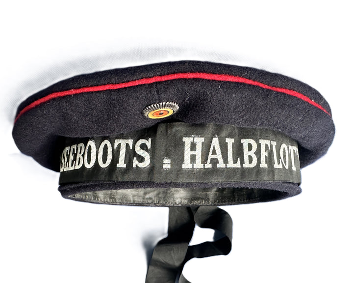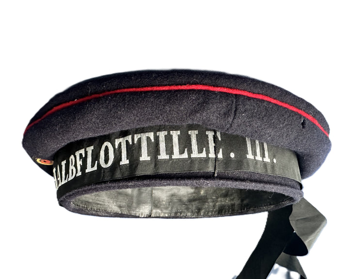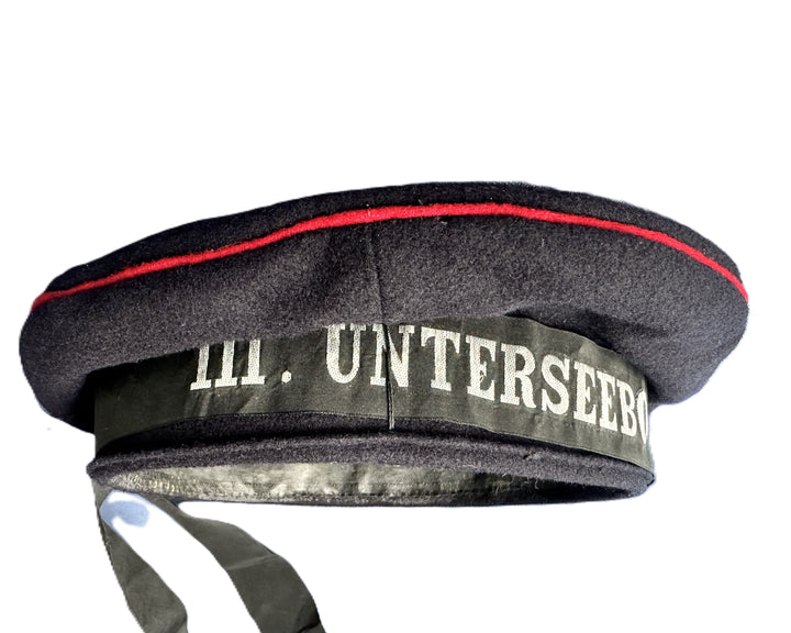 Imperial German Navy enlisted man’s cap (Mutze) originates from the III Unterseeboots-Halbflottille during World War I. The cap is constructed from a sturdy navy-blue wool blend, featuring the distinct red piping commonly used in the uniforms of the German Imperial Navy. The prominent black silk cap tally bears the embroidered designation “III. UNTERSEEBOOTS-HALBFLOTTILLE” in crisp white letters, signifying the cap's affiliation with the 3rd U-Boat half-flotilla, one of Germany's key naval forces during the war.