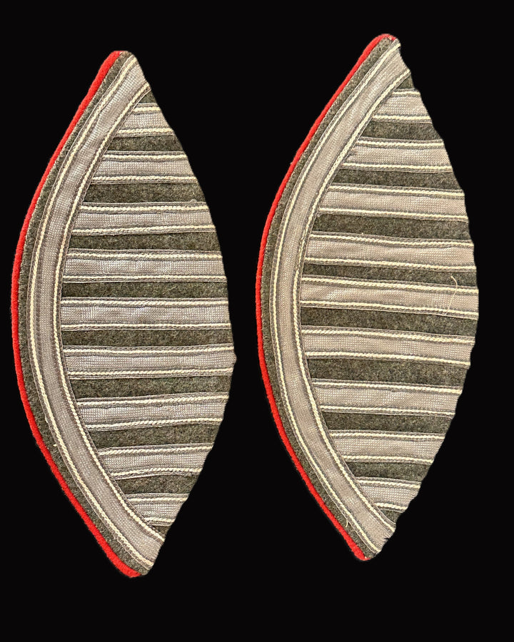 These Imperial German musician’s swallow’s nests were worn on the shoulders of military musicians, distinguishing them from standard enlisted or officer ranks. The silver bullion embroidery and red piping suggest use within an elite regiment, as musicians often wore elaborate insignia to make them easily recognizable on the field. Swallow’s nests were affixed to the shoulder seams of the tunic and were an integral part of the uniform for parade and ceremonial occasions. These are in exceptional condition, retaining their intricate design and color.