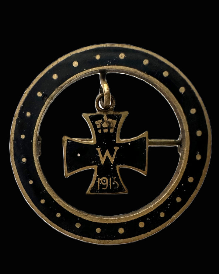 This round pin badge features a beautifully crafted Iron Cross suspended within a circular frame, accented by delicate gilded dots on the black enamel background. The Iron Cross bears the "W" monogram for Kaiser Wilhelm II, a crown at the top, and the date "1915" at the bottom, signifying its World War I provenance. These badges were often privately purchased and worn to signify pride in military service or to commemorate wartime achievements.