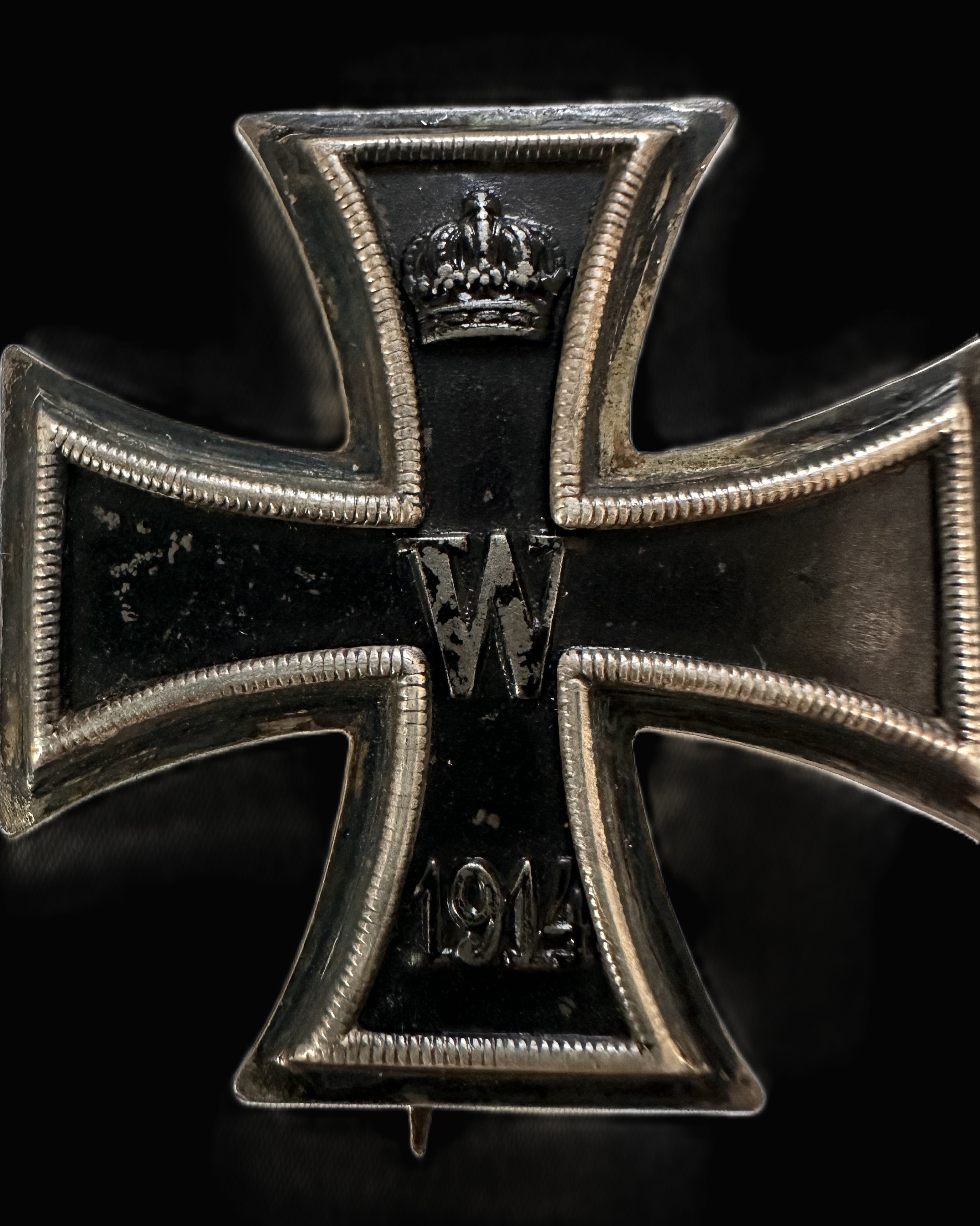 A classic flat-style 1914-pattern Eisernes Kreuz 1. Klasse (EK1), constructed in the traditional three-piece manner with a magnetic iron core seated within a silver (or silvered) frame. The obverse shows the raised Prussian crown at the upper arm, the “W” cypher of Kaiser Wilhelm II at center, and the date “1914” at the lower arm, all framed by the characteristic beaded inner border and a smooth outer rim. The core presents as a deep, aged black with honest handling sheen, while the frame retains a subdued bright line along the high edges where wear has burnished the finish over time. The reverse is a plain cross-form back plate fitted with the correct period pin assembly: broad barrel hinge at top, long tapered pin, and round wire catch at the lower arm—exactly the hardware profile collectors expect on early-to-mid war EK1 manufacture.