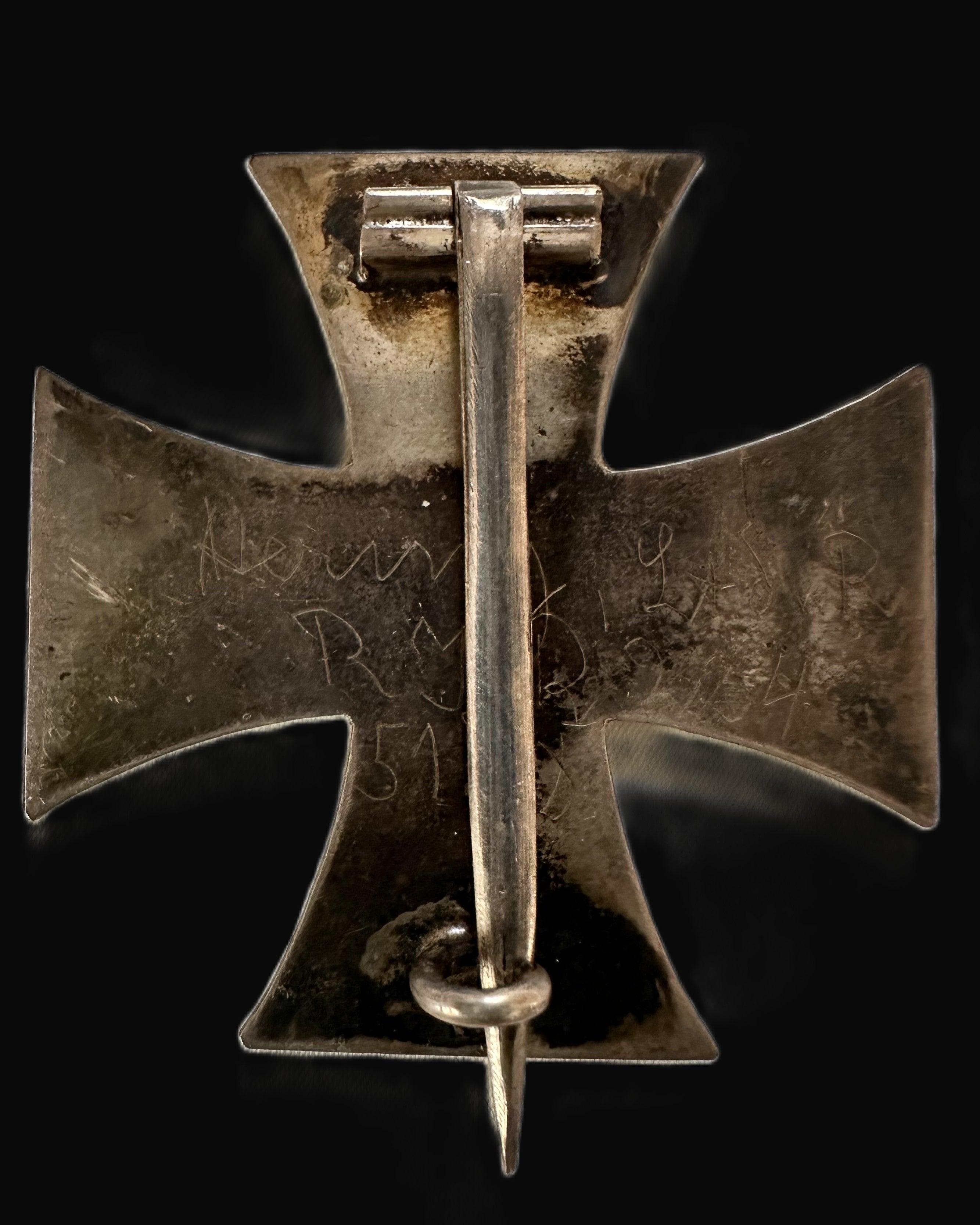 Condition is honest, service-worn, and collector-correct for a combat-era piece: moderate oxidation and dark toning across the reverse, scattered surface scratches and rubs to the frame edges, and visible wear to the blackened core with small scuffs that do not distract from the overall presentation. The pin hardware appears intact and period, with no obvious breaks visible in the hinge or catch. The engraved reverse shows age-consistent patina within the incised lines, which supports the engraving as period-applied rather than modern. Overall, this is a strong collector’s EK1 with desirable personalization and the right “been there” look that militaria buyers increasingly prioritize over over-cleaned examples.