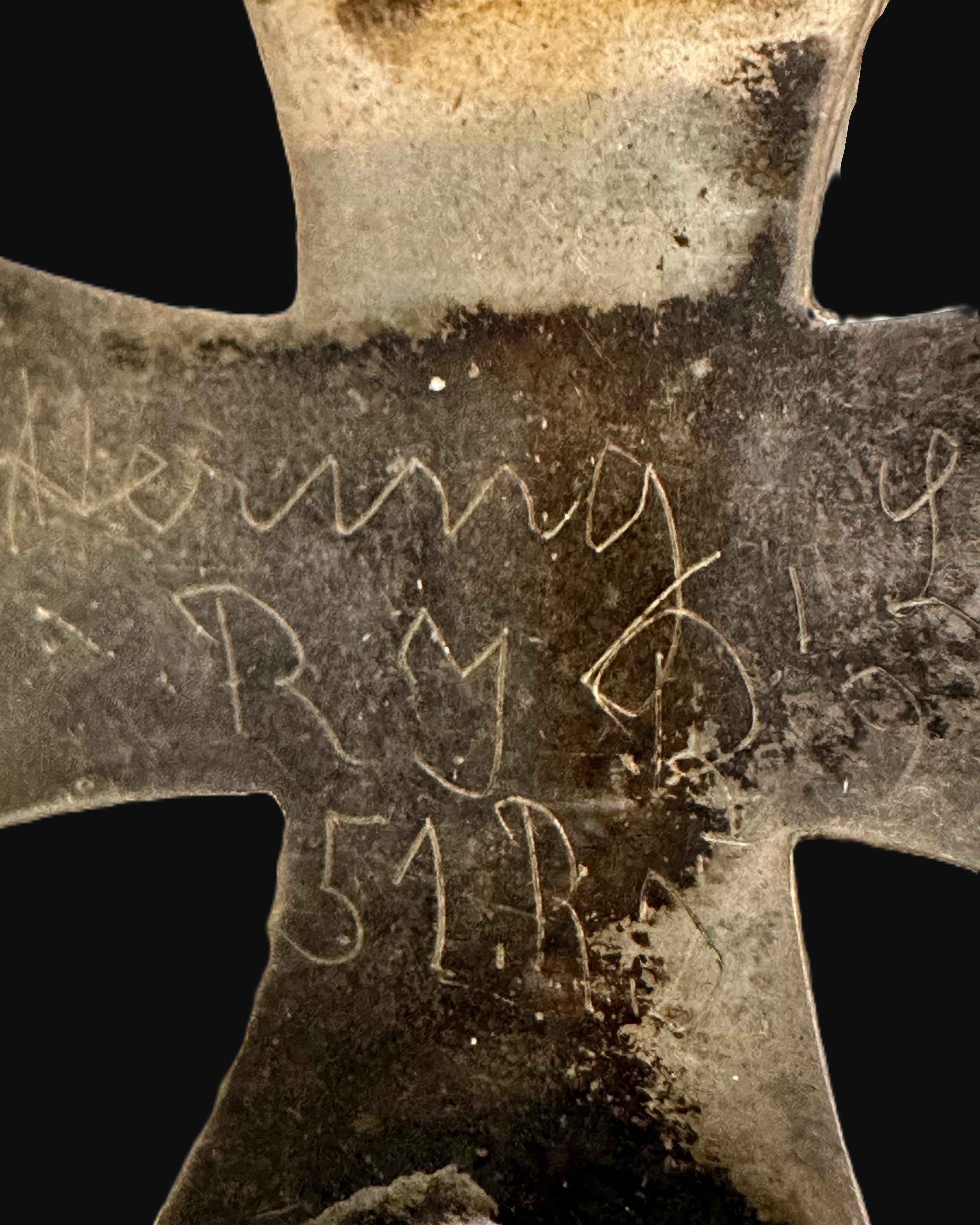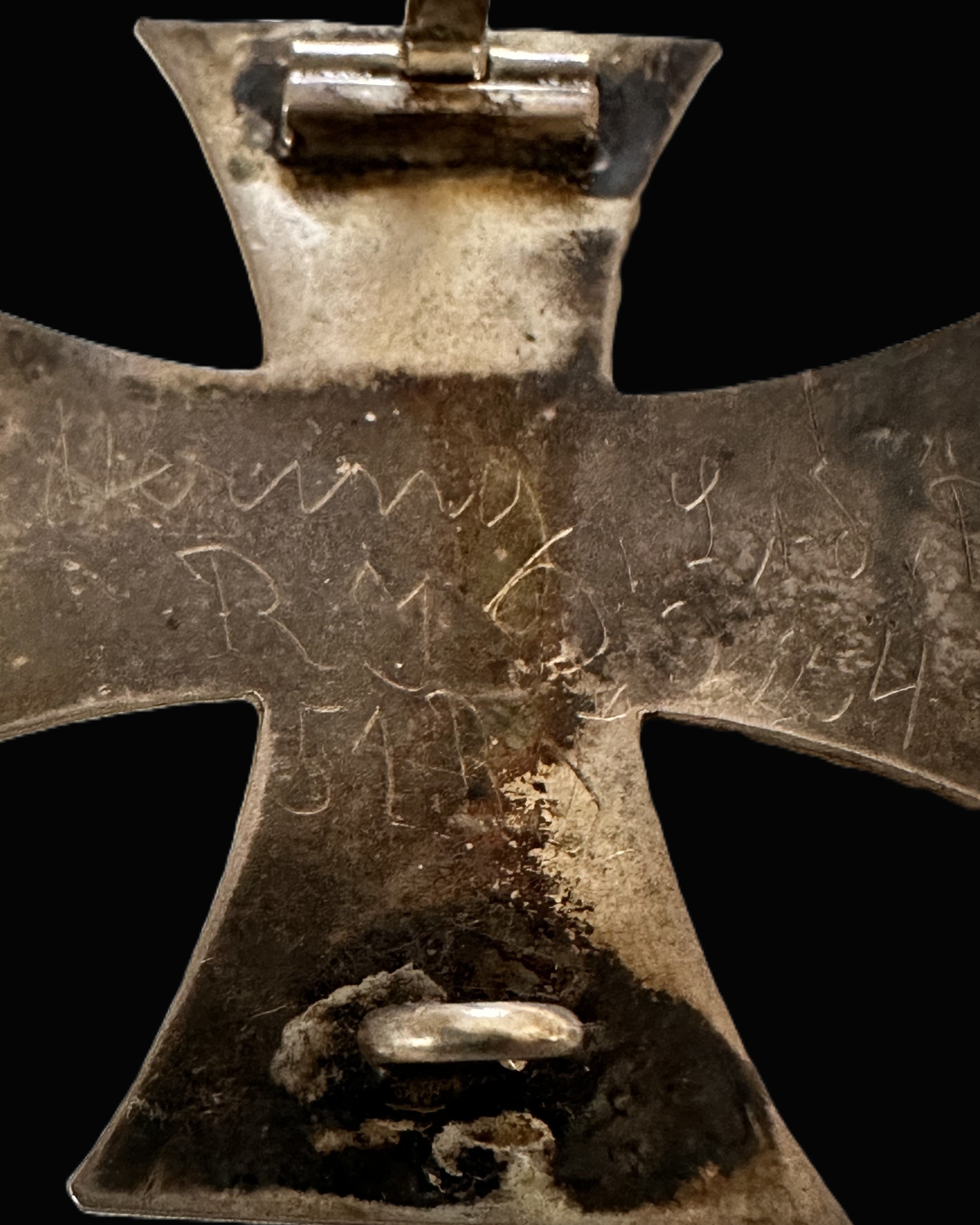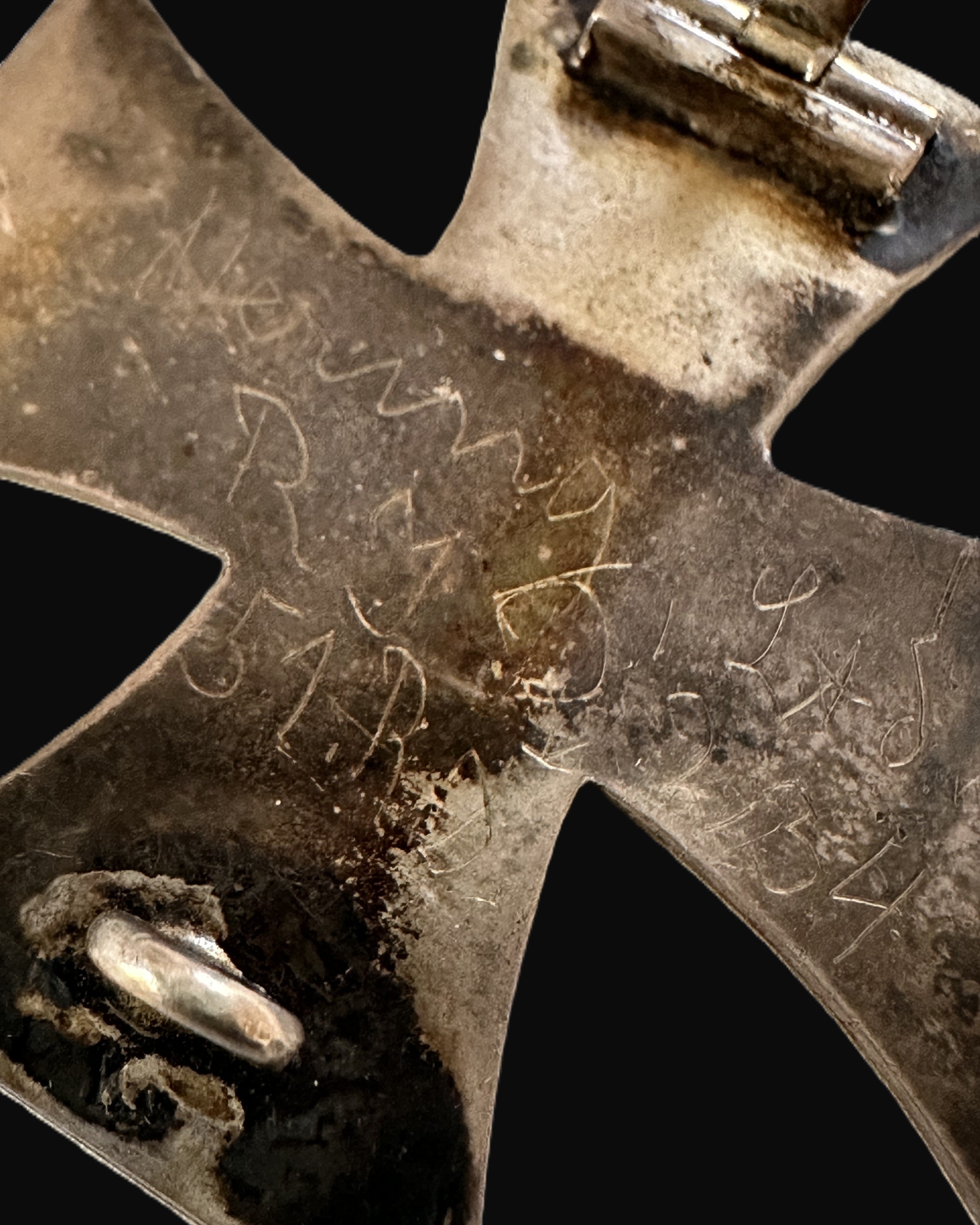 What elevates this example beyond a standard EK1 is the period field engraving on the reverse. The inscription is hand-scratched in a soldier’s “trench style,” uneven in depth and line quality as expected when done quickly with an improvised tool rather than by a jeweler. From the photos, the engraving appears to read along the lines of a first name “Heinry/Heinri…” (very likely intended as Heinrich, a common German given name), followed by initials that look like “R M,” and a line that appears to include “51 R” (consistent with a regiment-style shorthand such as “51. R.”). On the right side, there appears to be a date formatted like “9.1.18” (or similar), which would align with late-war personalization practices. Because the name and unit-style notation are partially indistinct in the surviving surface scratches and oxidation, it would be irresponsible to “match” this conclusively to a specific soldier from photographs alone—however, the format itself is entirely consistent with privately engraved pieces where the recipient (or a comrade) recorded identity and unit details for posterity. If you want to pursue a hard attribution, the next step would be a clearer macro photograph under raking light of each line of the inscription; with a confident read of the exact spelling and the regiment notation, you can then compare against period rolls for the relevant unit.