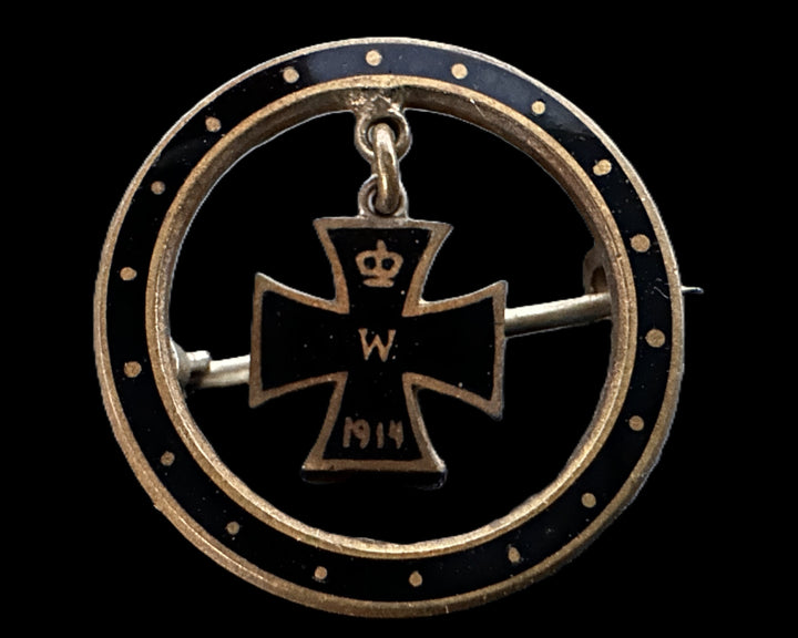 This stunning miniature brooch pin features the iconic Iron Cross design, a symbol of valor and honor within the Imperial German military. Crafted in metal with intricate black enamel detailing, the Iron Cross displays the hallmark "W" for Kaiser Wilhelm II and the year "1914," denoting its World War I significance. Surrounding the cross is a circular gold-tone frame accented with delicate polka-dot decorations, adding an elegant touch to this historic piece.