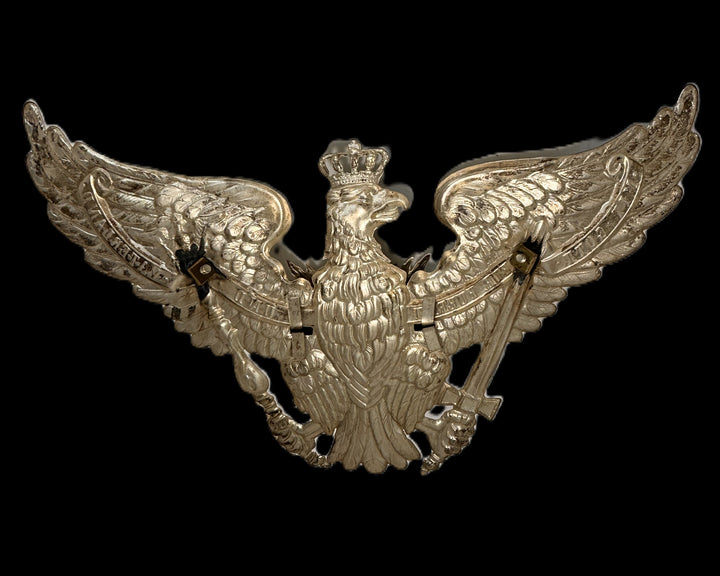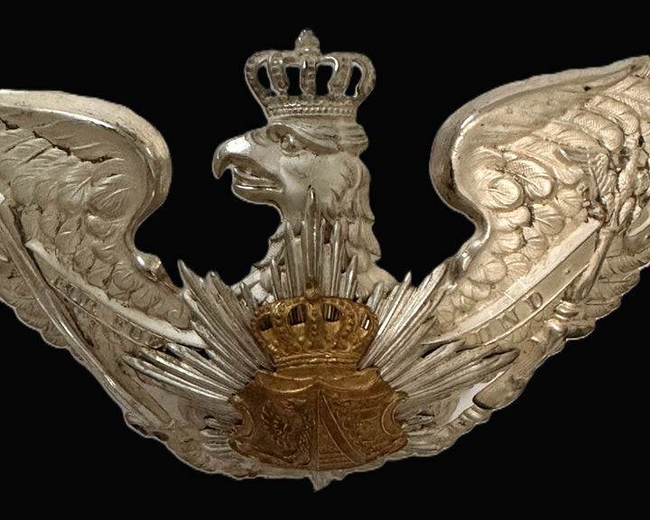 A scarce, high-grade Lippe-Detmold officer’s helmet Wappen, executed in the classic Imperial-era “spread eagle” format with a richly detailed, silver-toned body and a separately applied gilt state shield at center. The eagle is sharply struck with deep relief across the layered feathering—most notably in the wing coverts and the heavy, sculpted breast plumage—giving the piece strong dimensionality even under flatter lighting. The head is crisply modeled with a pronounced hooked beak and a finely rendered crown, while the wings terminate in broad, rounded tips typical of officer-grade cast or die-formed plates rather than the thinner, flatter enlisted patterns. Across the wings run the traditional motto scrolls, cleanly formed and fully legible, and the entire composition is anchored by a radiant burst behind the state shield, creating the unmistakable “court appointment” look intended to read at a distance on parade.