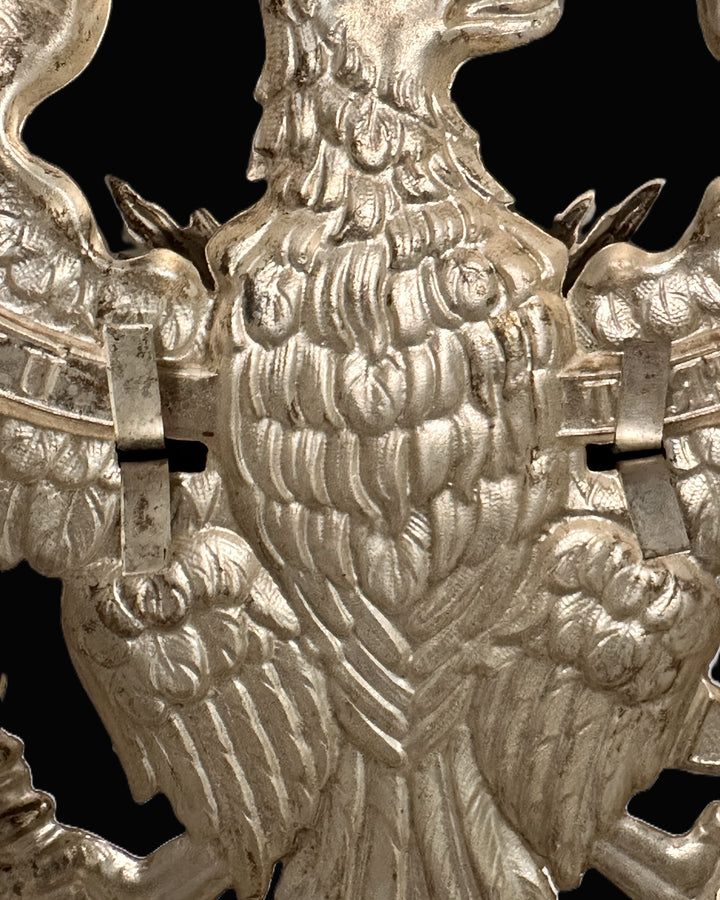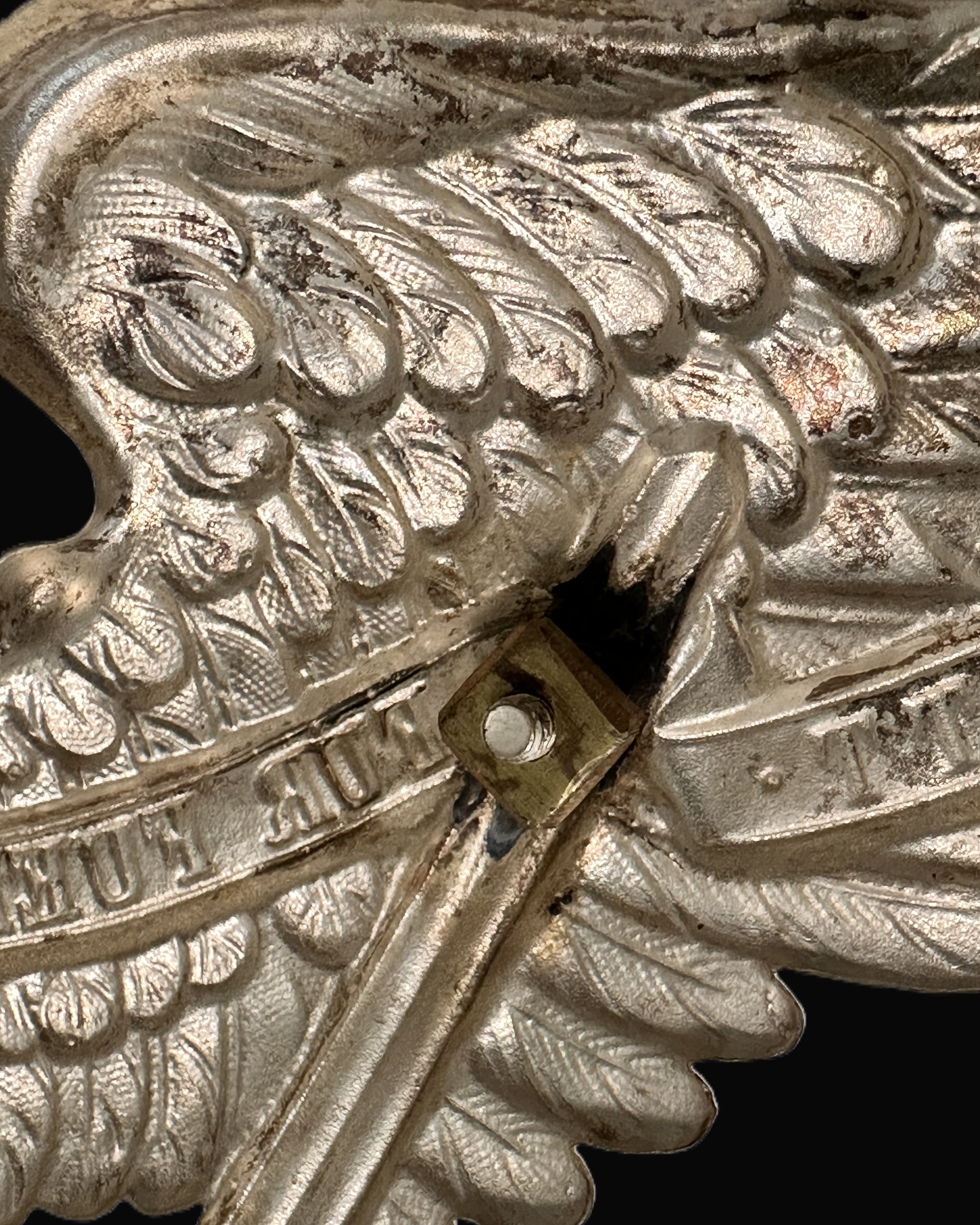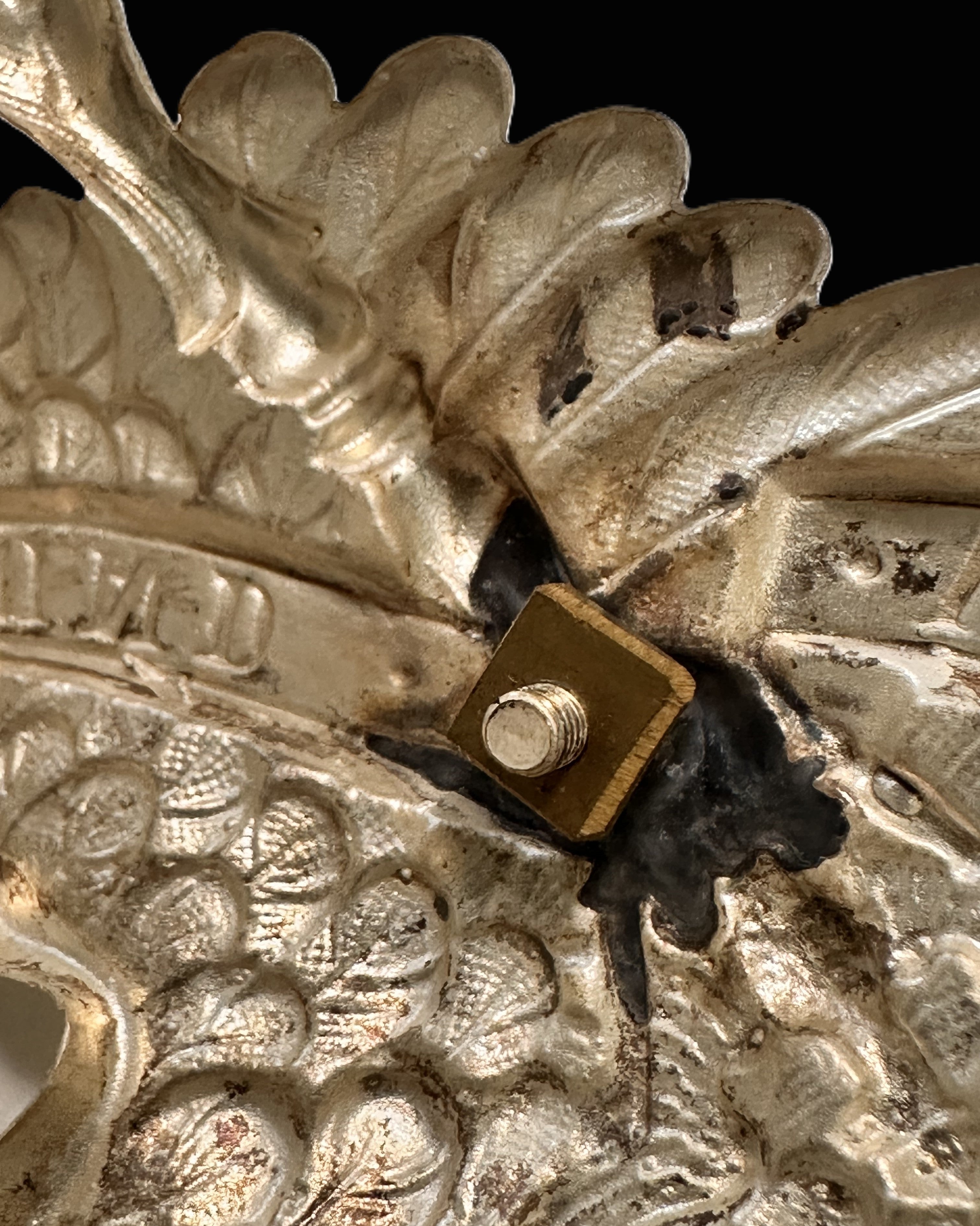 Construction and mounting hardware are consistent with an officer’s plate intended for repeated removal and refit across helmets and fittings. The reverse shows the correct mounting system with threaded posts and square brass backing plates/nuts, and there is visible period mounting compound/residue in the hardware zones, exactly what you expect to see when a plate has lived a real service life on a helmet rather than sitting loose in a drawer. The reverse finish shows age, oxidation, and handling marks in the normal places, with no “too perfect” uniformity. From a practical standpoint, the presence of the original-style hardware is a material value driver: it reduces the friction of restoration, display mounting, and authentication because the whole assembly reads as one coherent, period-correct unit rather than a plate that has been stripped and re-rigged.