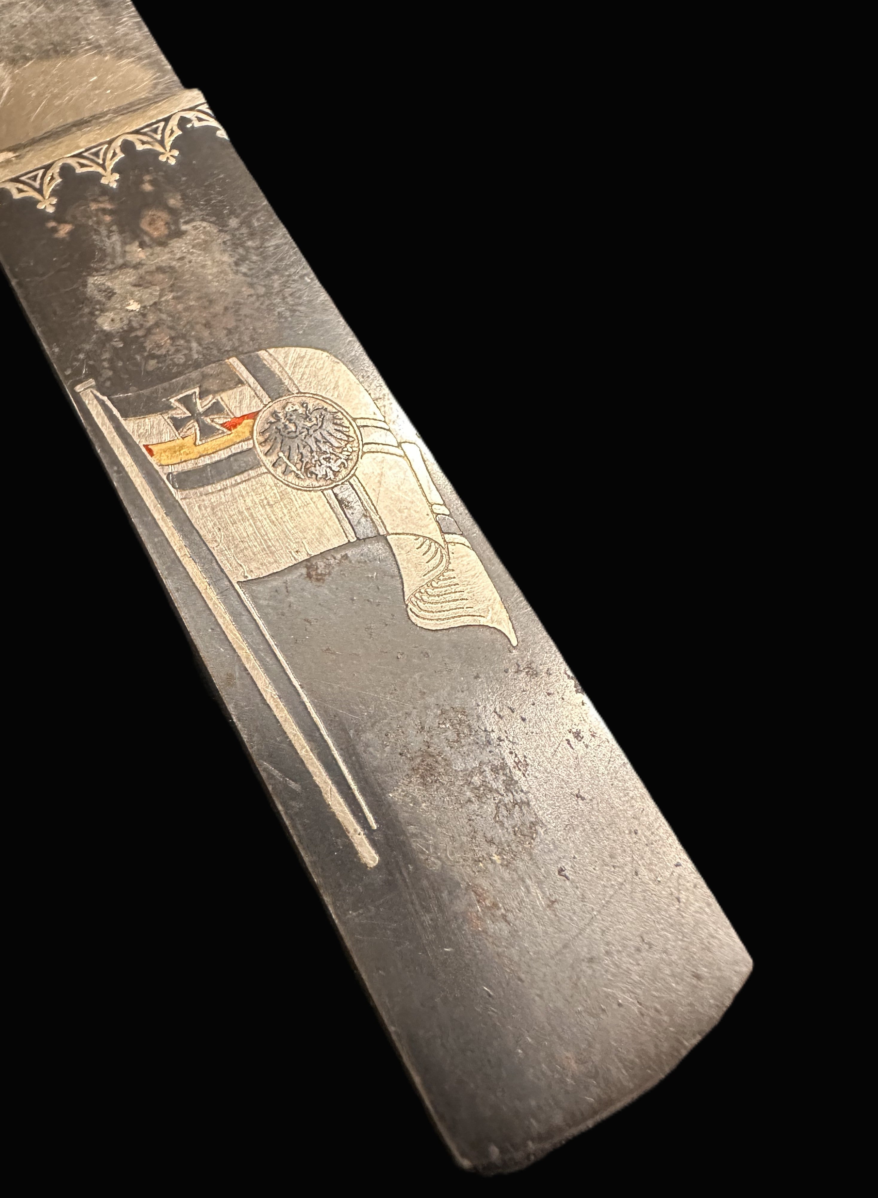 Pieces incorporating the Reichskriegsflagge are sought after by collectors of naval militaria, as they represent not only the martial spirit of the Kaiserliche Marine but also the national identity of the Wilhelmine era. Surviving examples with intact etching and gilt detail, as here, are increasingly scarce.