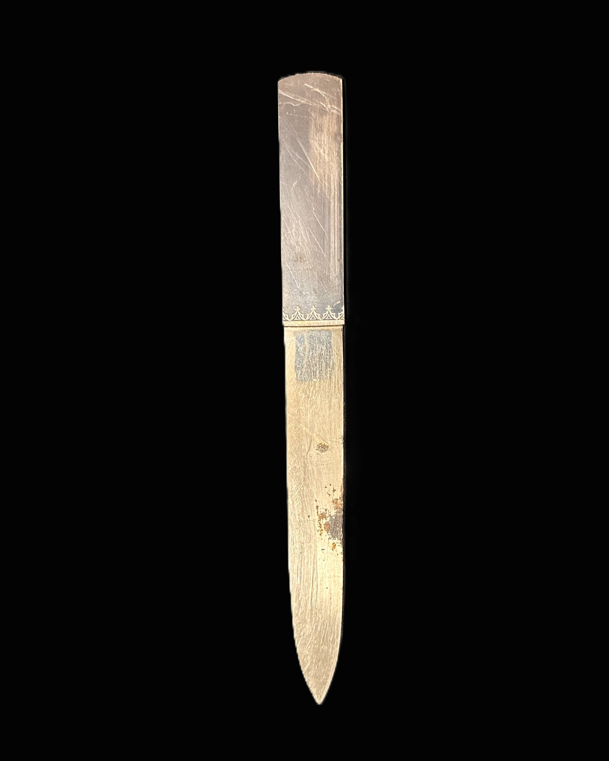 Steel blade shows age-related wear, surface scratches, and light spotting.