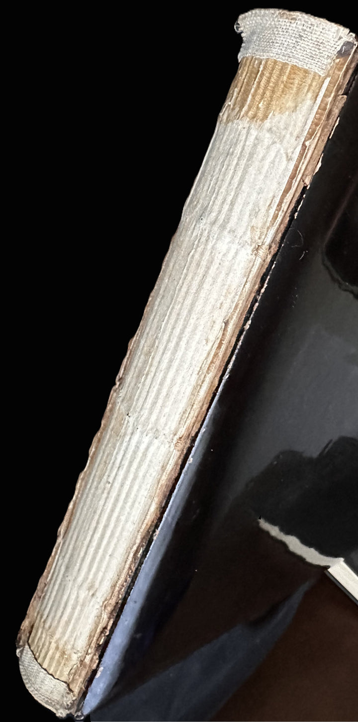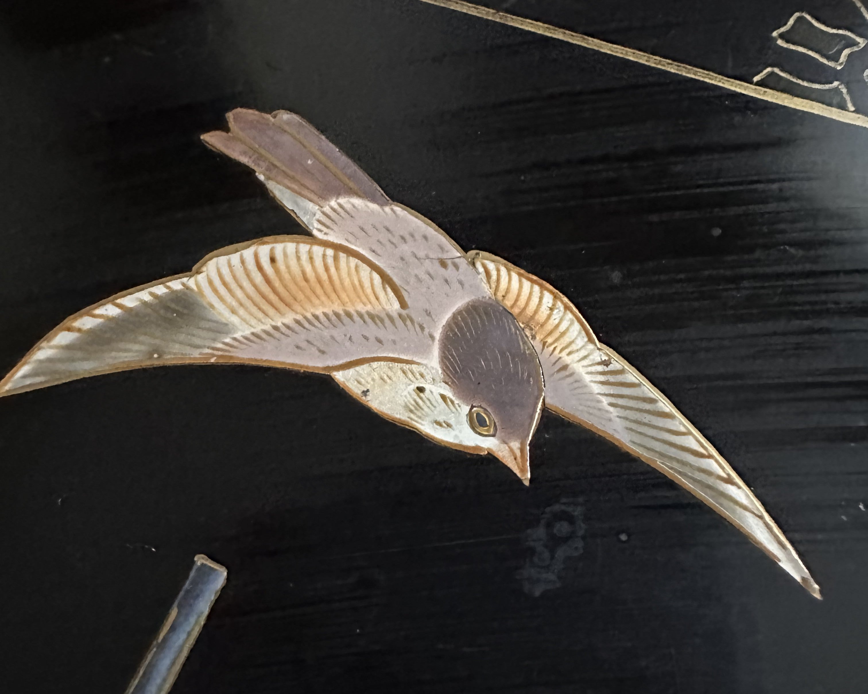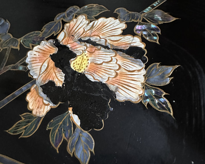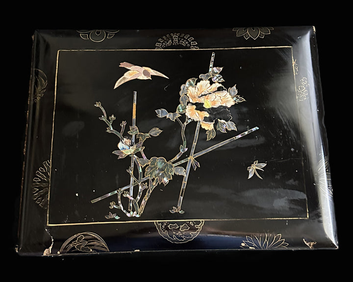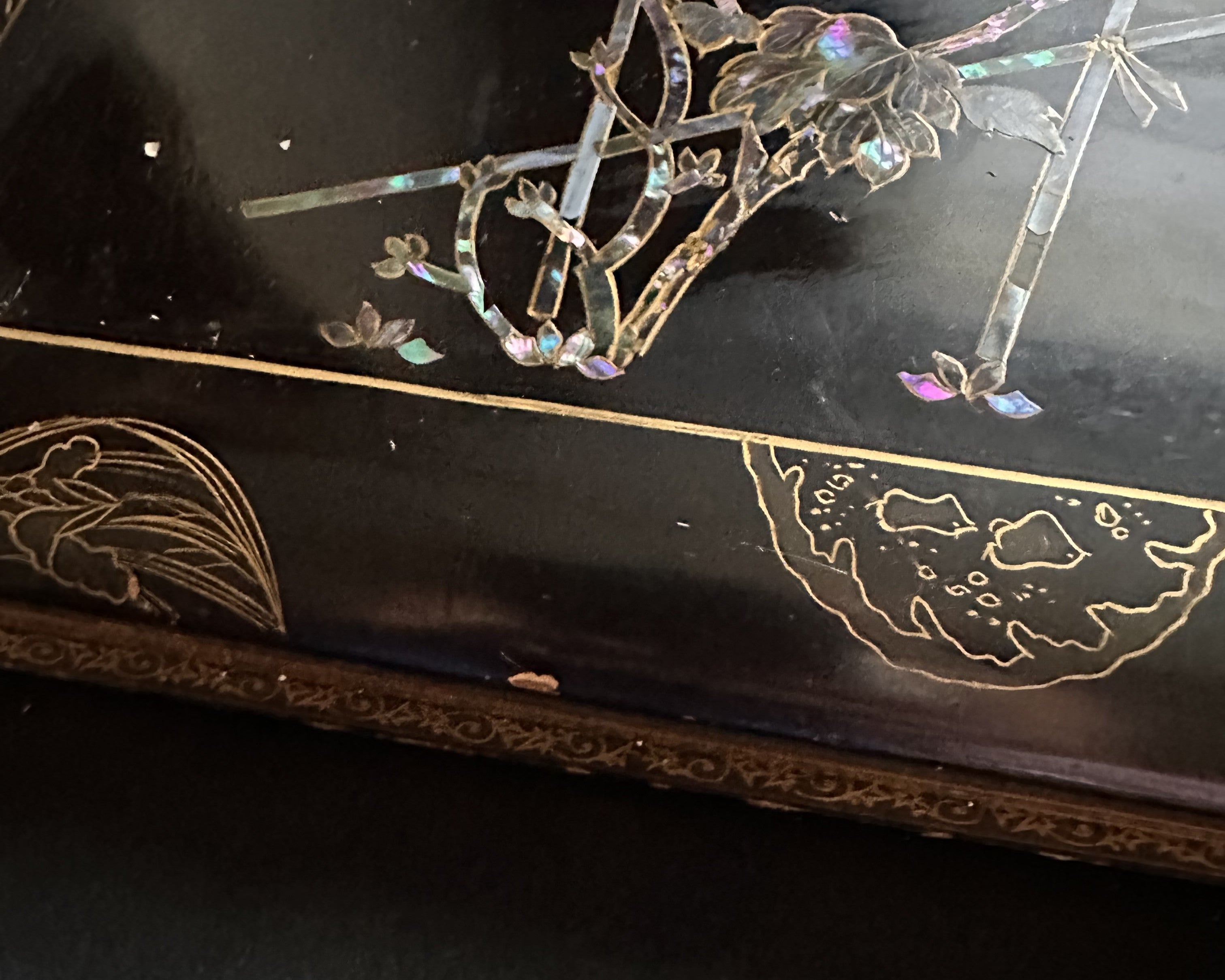 Exterior: Lacquered cover shows surface wear, edge chipping, and loss to the floral inlay, typical for age and handling.
