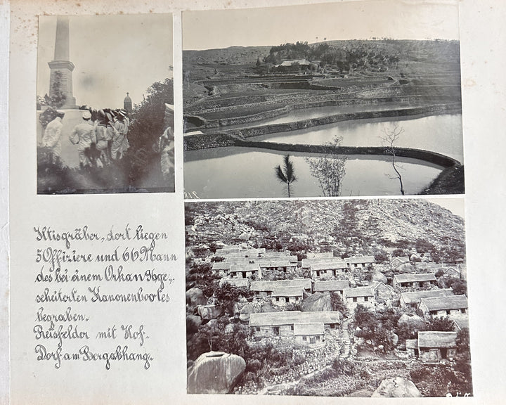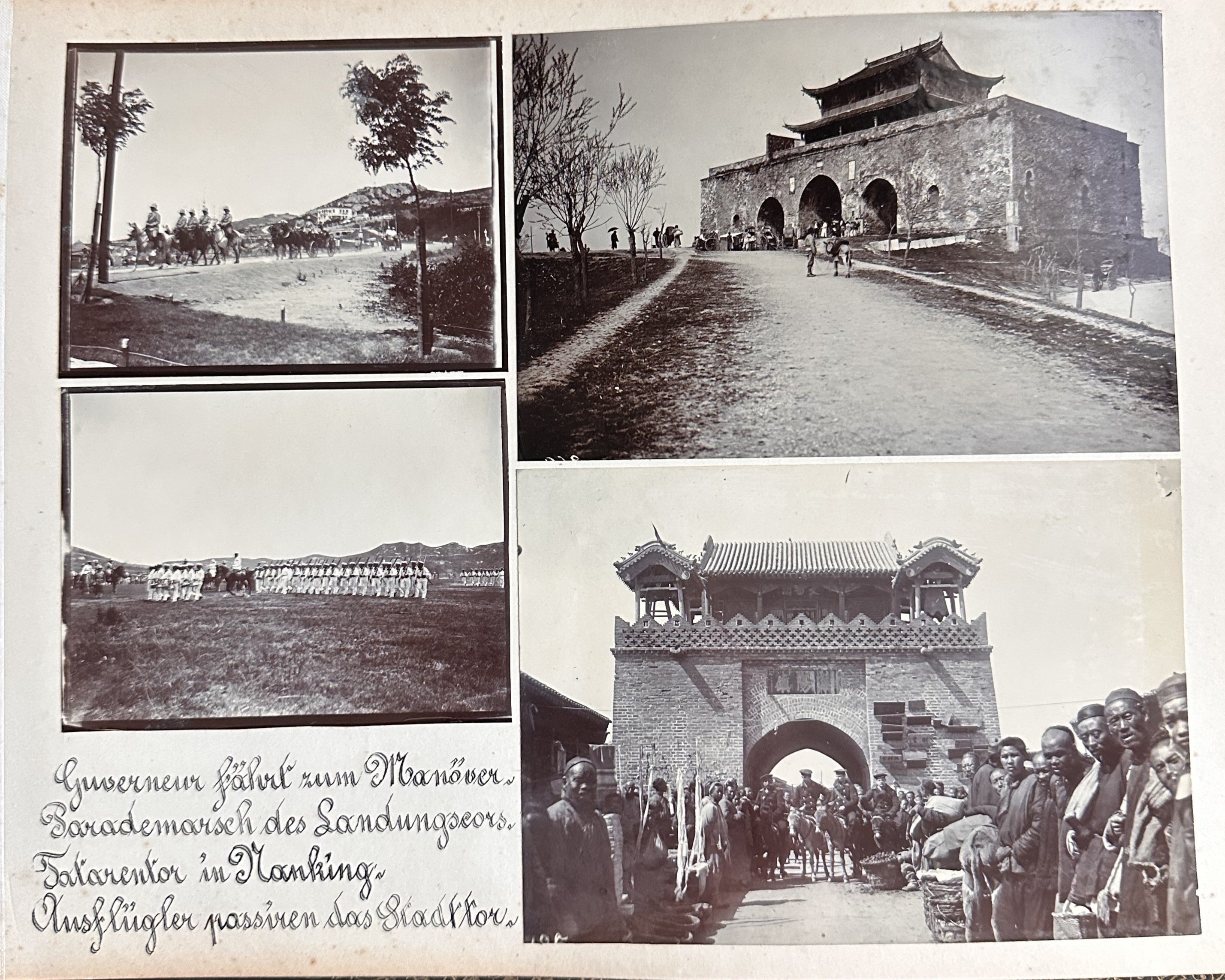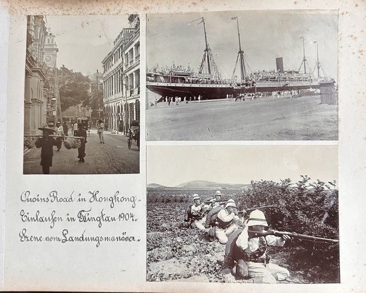 The album provides a vivid snapshot of Imperial Germany’s naval presence in East Asia during a period of both colonial expansion and increasing tension with Japan, Britain, and other powers. Albums of this type were often commissioned by officers or sailors as personal keepsakes, combining locally purchased hand-colored scenic views with private snapshots documenting maneuvers, daily life, and military engagements.