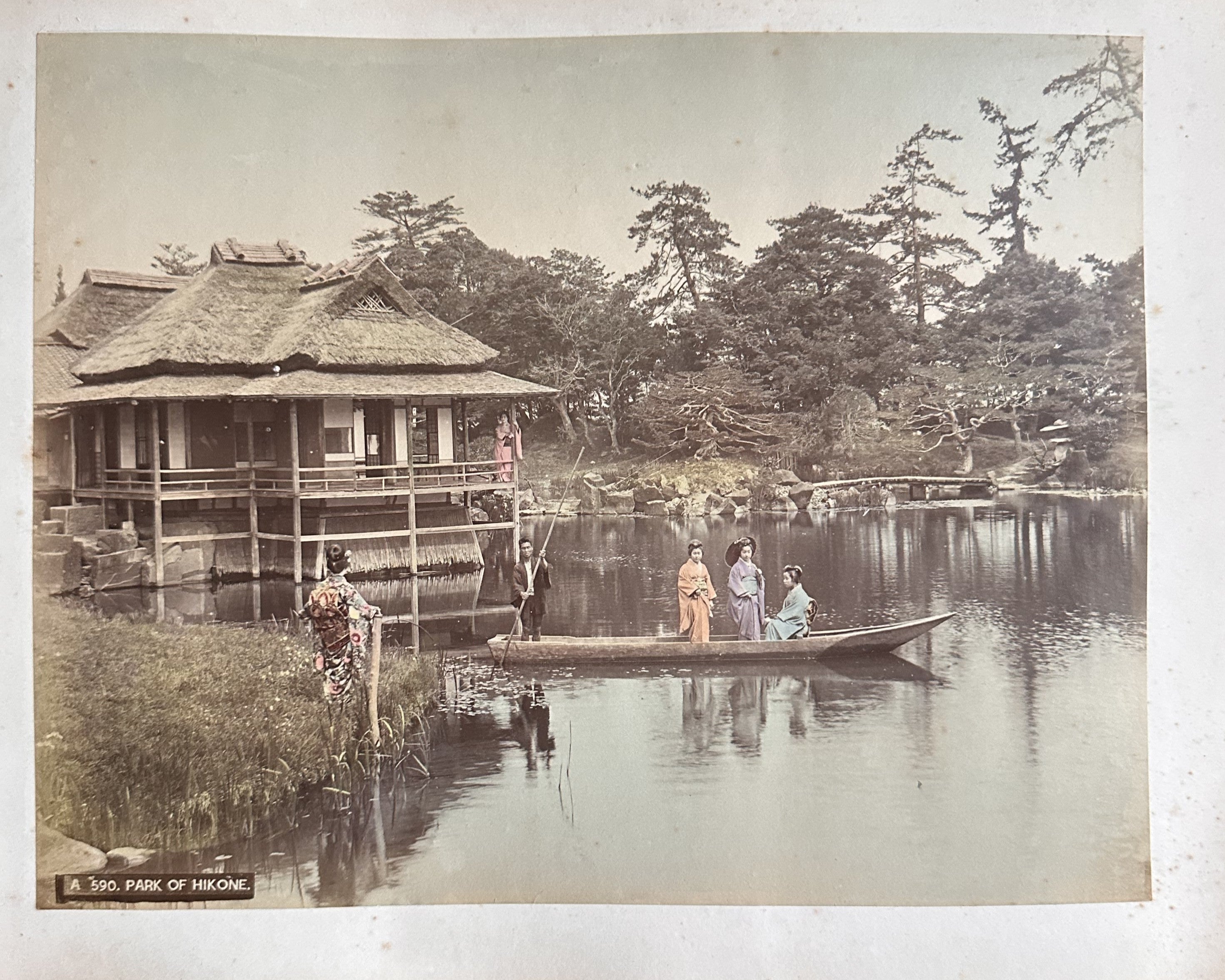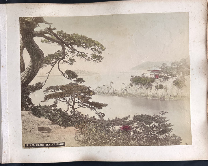 Japanese scenic views, such as the Inland Sea at Bingo, Hikone Park, and traditional houses with geisha and boats, clearly purchased from Japanese commercial studios specializing in tourist albums.