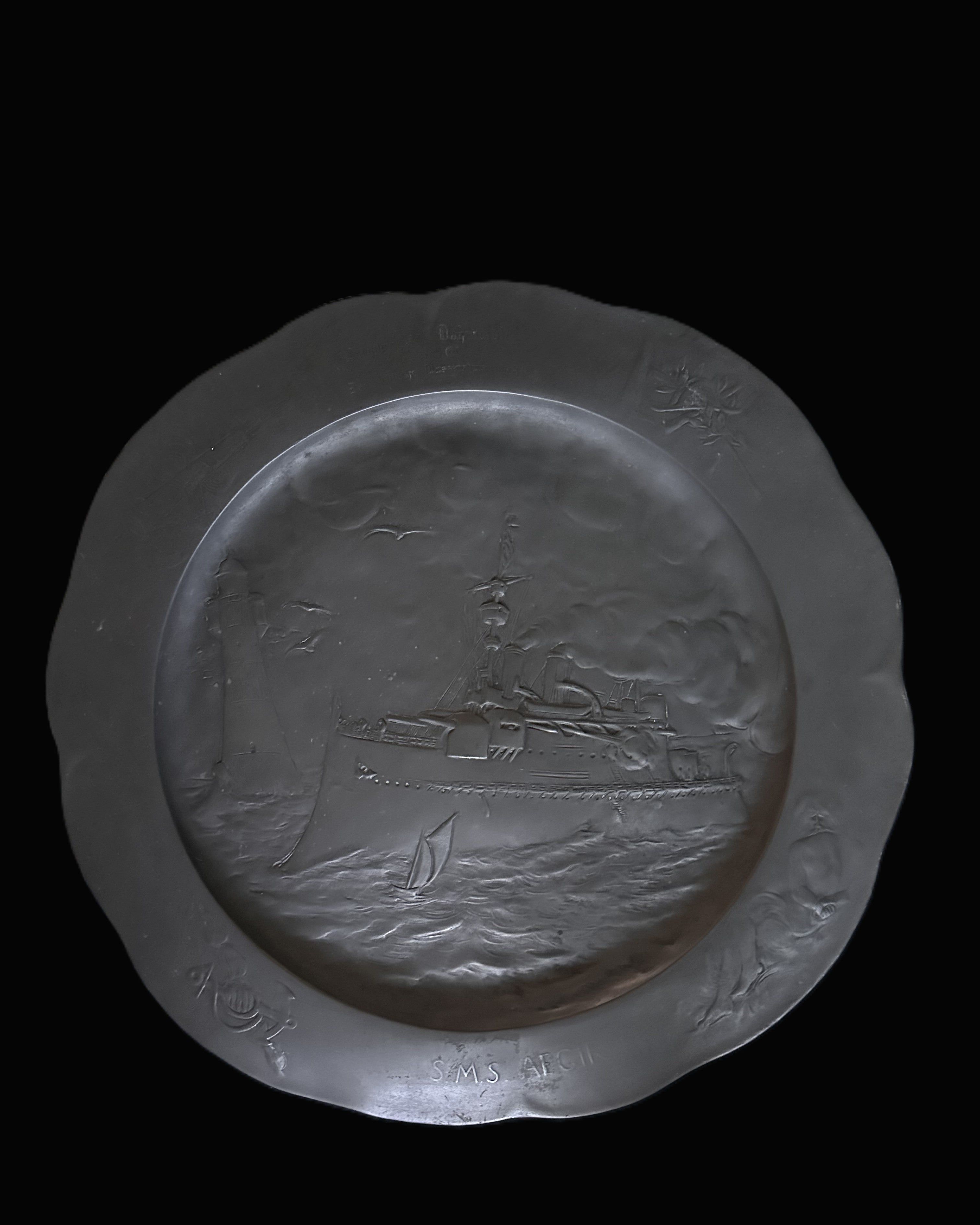 This pewter wall plate commemorates the SMS Ägir, a Siegfried-class coastal defense ship of the Kaiserliche Marine. The vessel was laid down in 1892, launched in 1893, and entered active service in 1896, part of a fleet of eight ships designed to defend Germany’s relatively short but strategically vital North Sea and Baltic coastlines.