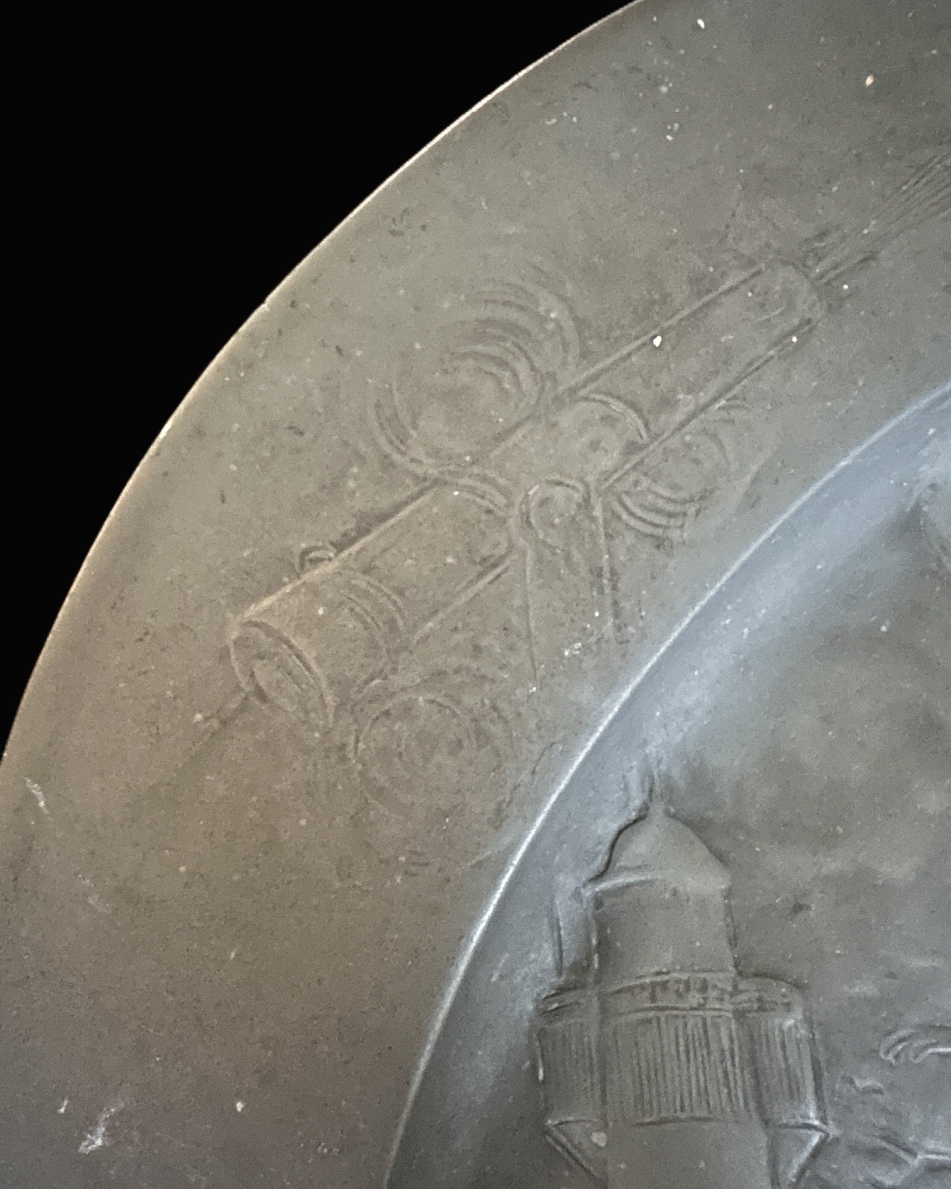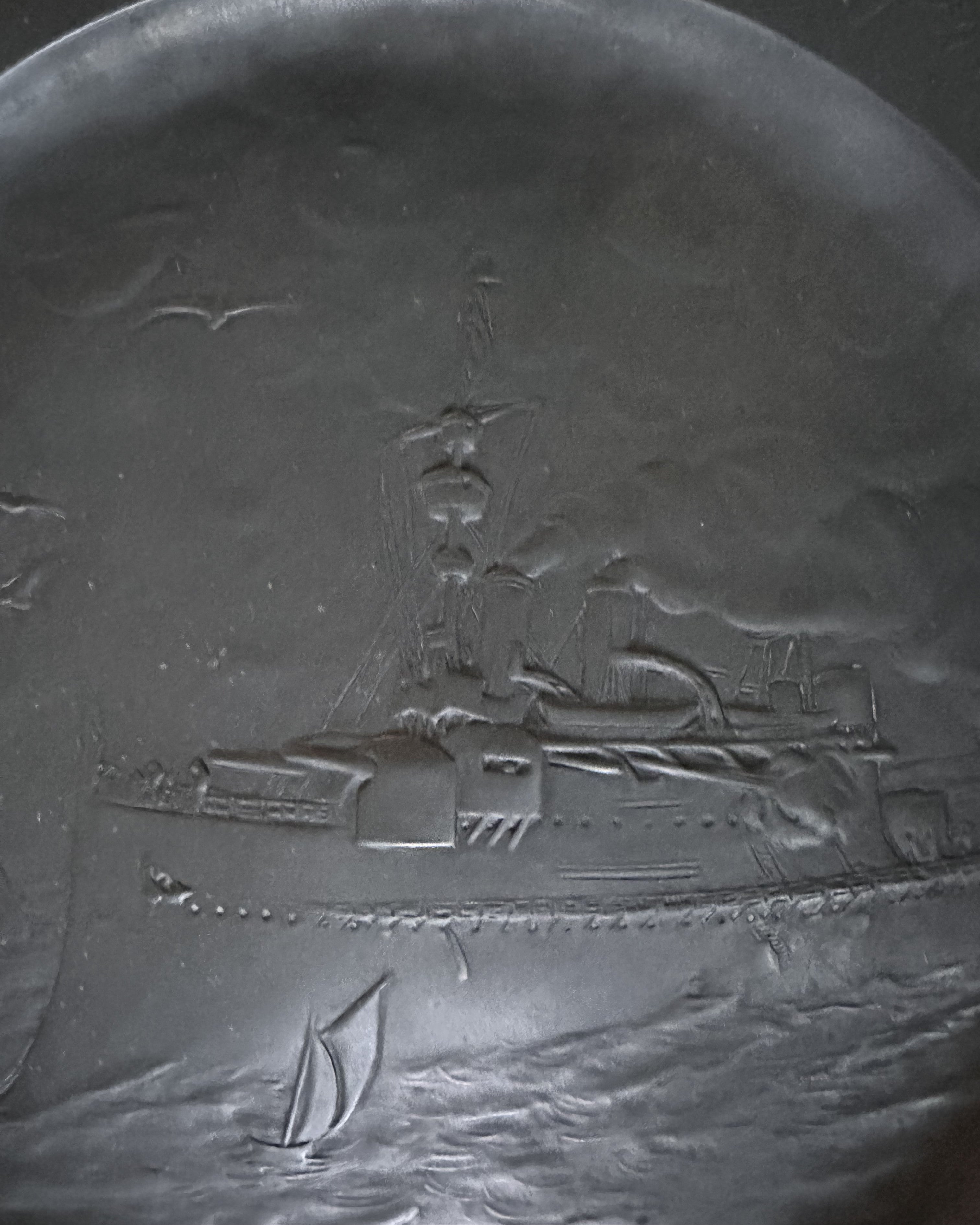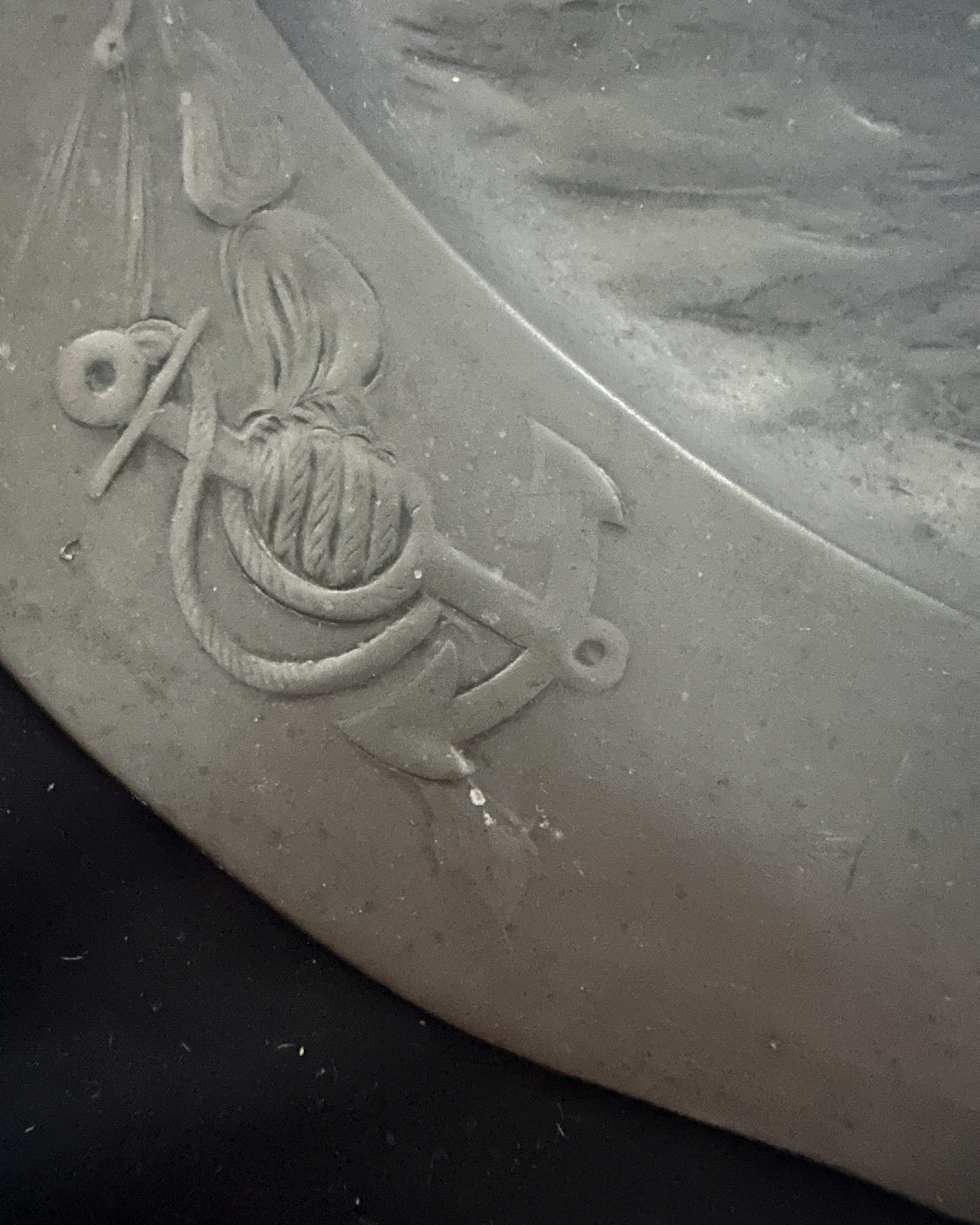 The plate’s central motif shows the SMS Ägir at sea, rendered in relief with remarkable detail: the heavy casemate-mounted guns, prominent funnels, and bow wave emphasize her power. The surrounding rim is decorated with maritime imagery — a lighthouse guiding the vessel, an anchor with coiled rope symbolizing naval steadfastness, and a signal cannon recalling naval gunnery.