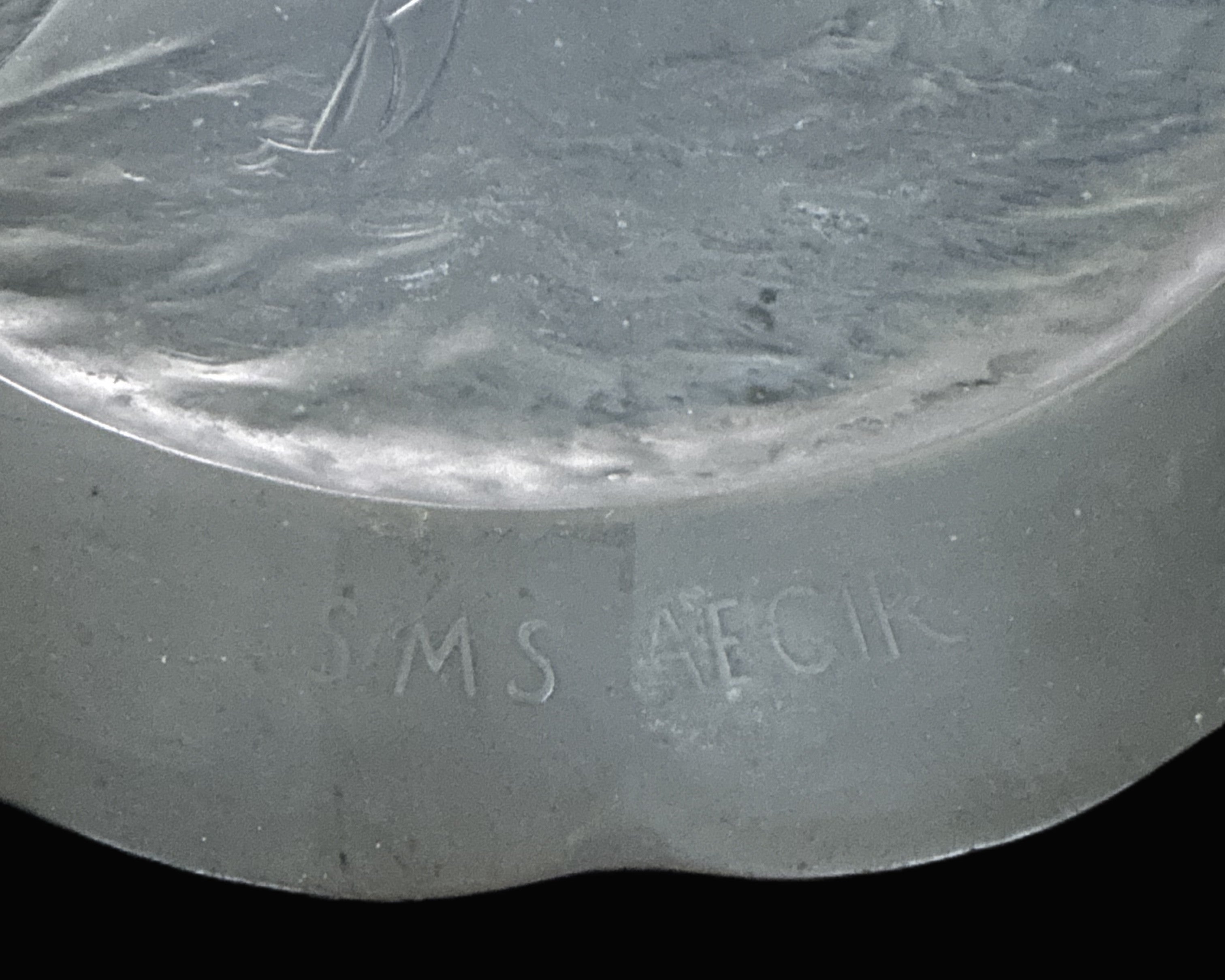 The ship’s name “S.M.S. ÄGIR” is boldly embossed at the bottom. At roughly 20 inches in diameter, the piece has a scalloped edge and retains its original hanging cord, evidence that it was intended for display — possibly in an officer’s home or naval wardroom.