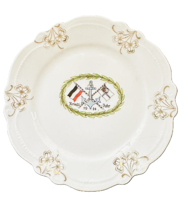 This delicate porcelain dessert plate dates to the World War I era (1914-1918) and was crafted in Germany. Its intricate design reflects a high level of craftsmanship associated with patriotic and commemorative tableware produced during the time. The plate prominently displays a wreath encircling the Imperial German Navy’s anchor insignia and flags, symbolizing loyalty to the Kaiserliche Marine (Imperial German Navy) during the Great War.