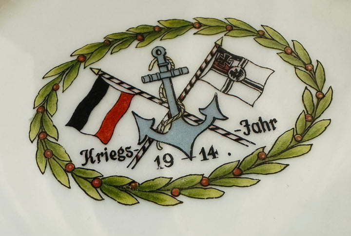 - Central Decoration: The anchor, flanked by the Imperial German war flag and the tricolor national flag, signifies the plate’s naval connection. The inscription "Kriegsjahr 1914" (“War Year 1914”) solidifies its association with the outbreak of World War I.