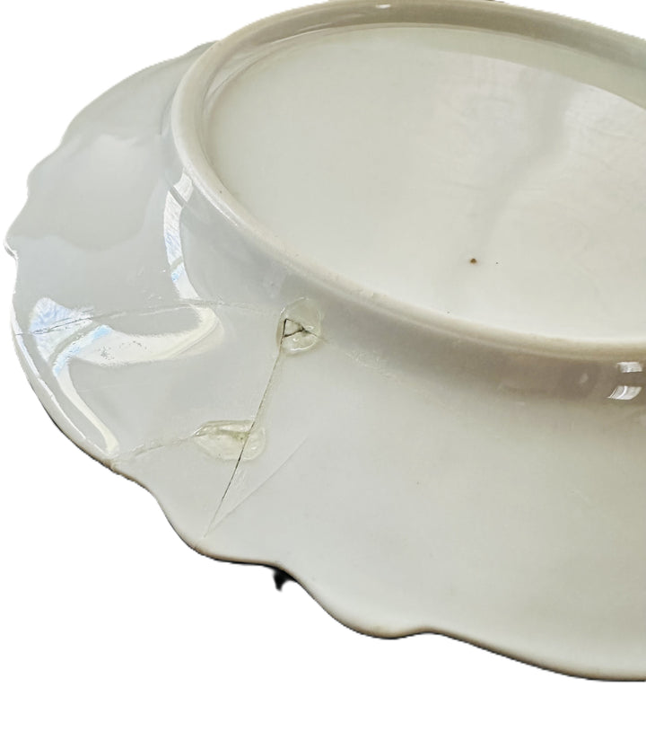 - The plate shows visible damage, including a crack and evident repairs along the base. The repairs appear to have been conducted with care, but they detract from the overall value and structural integrity.