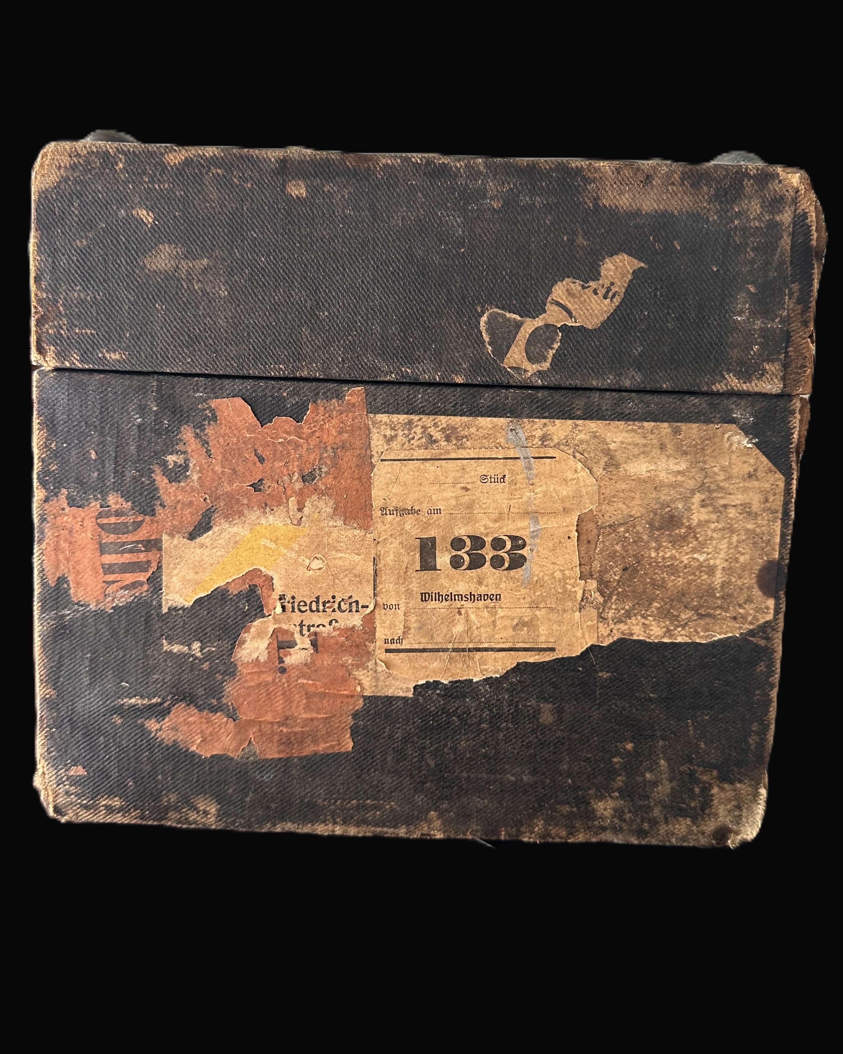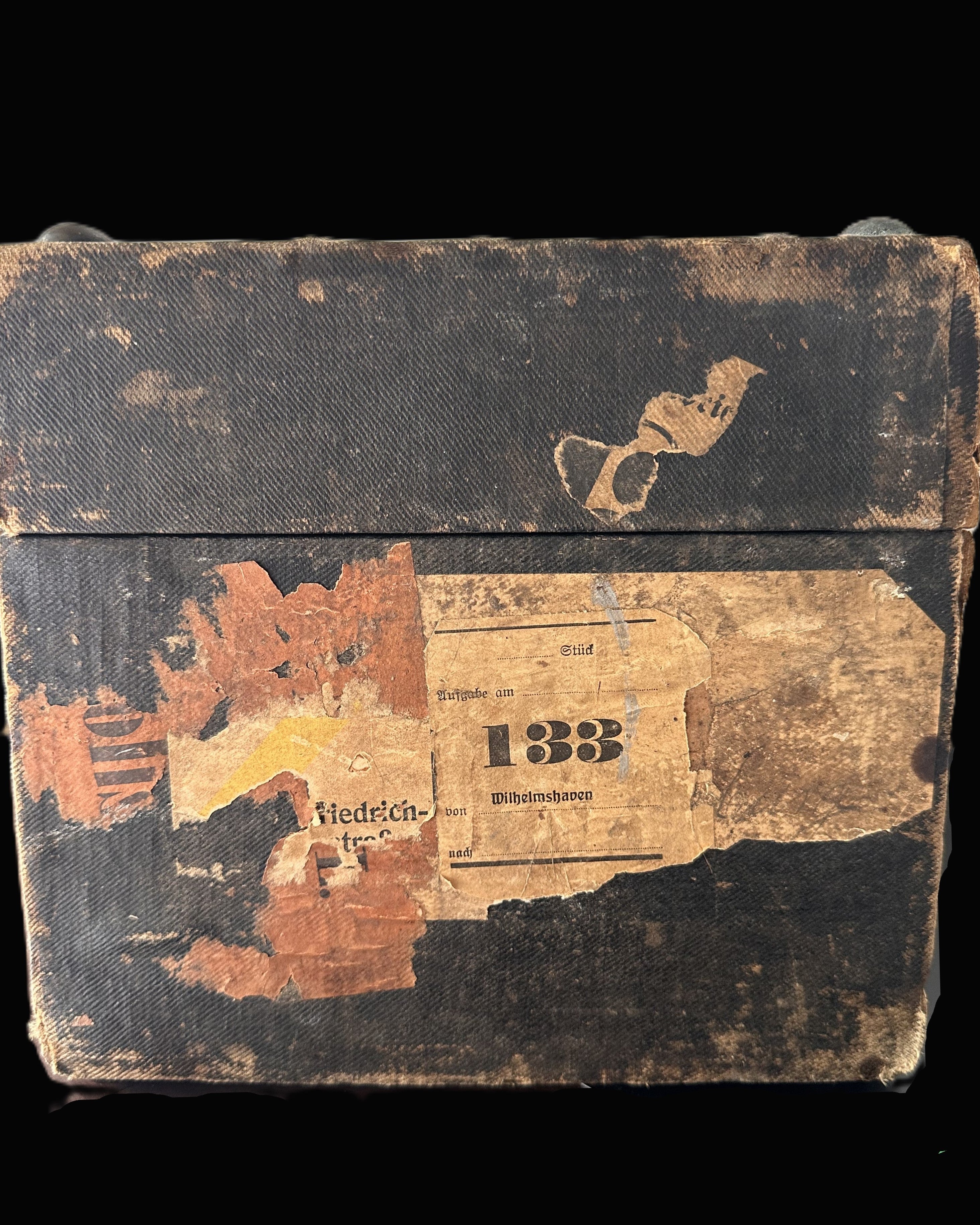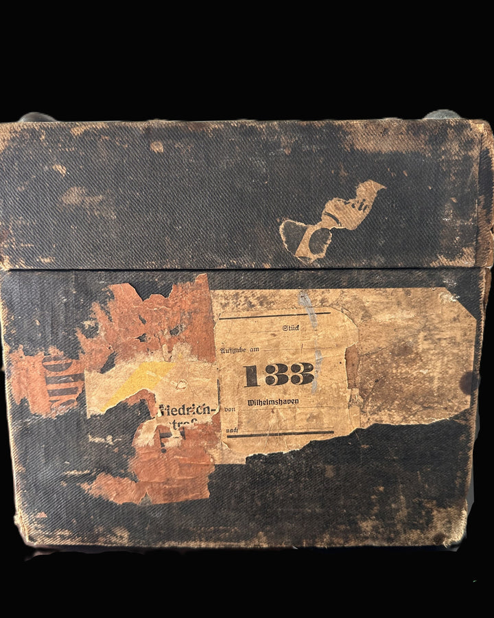 - Aged travel labels and naval transport markings indicate extensive use within the Imperial German Navy.