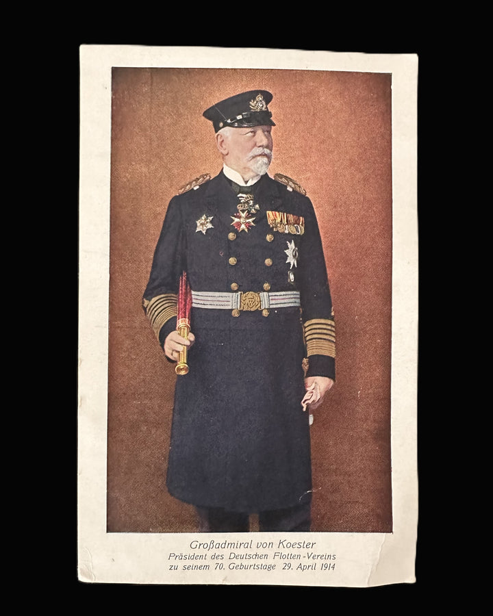 - A colorized postcard from 1914, celebrating von Koester’s 70th birthday and his tenure as President of the German Naval Association (Deutschen Flotten-Vereins).