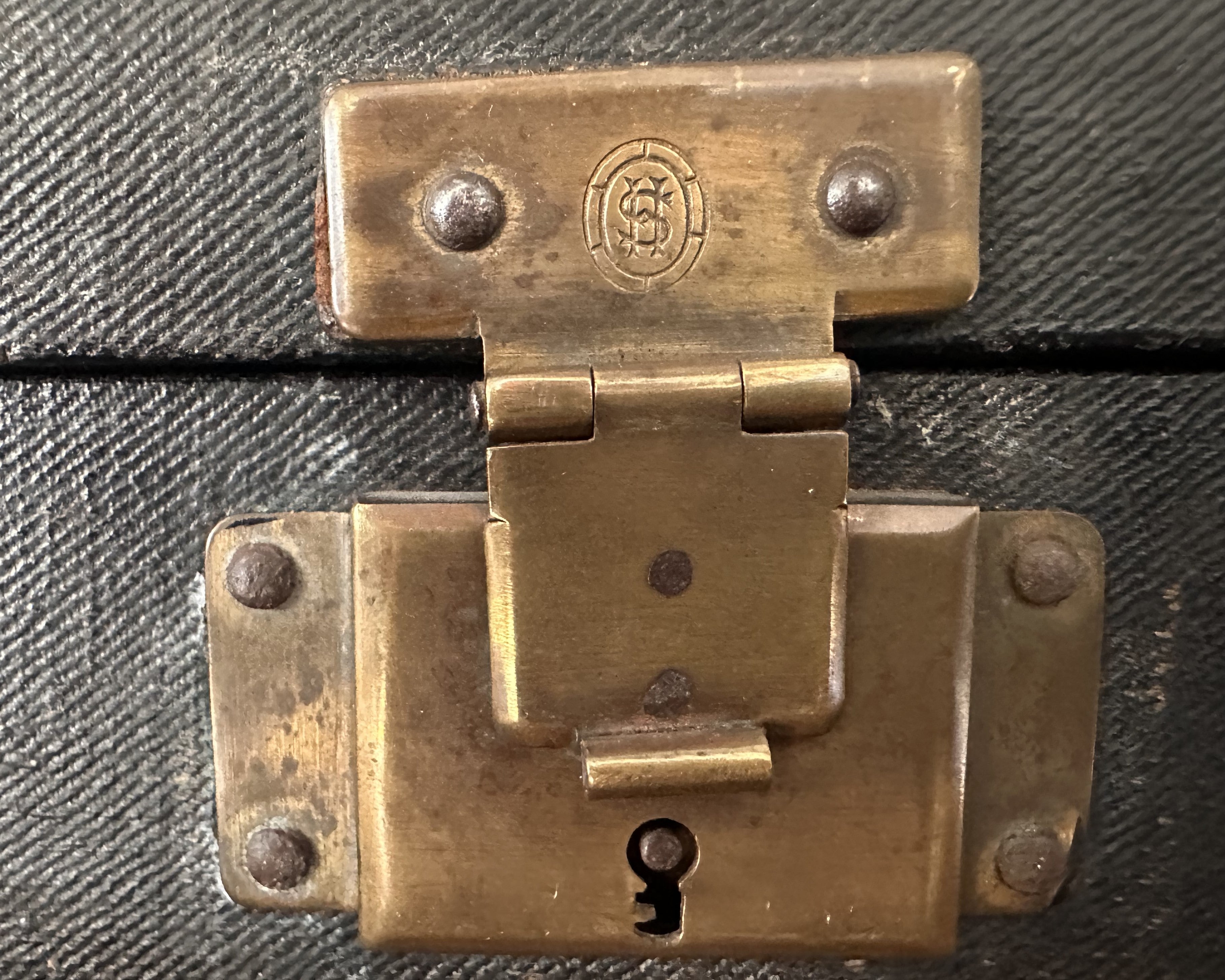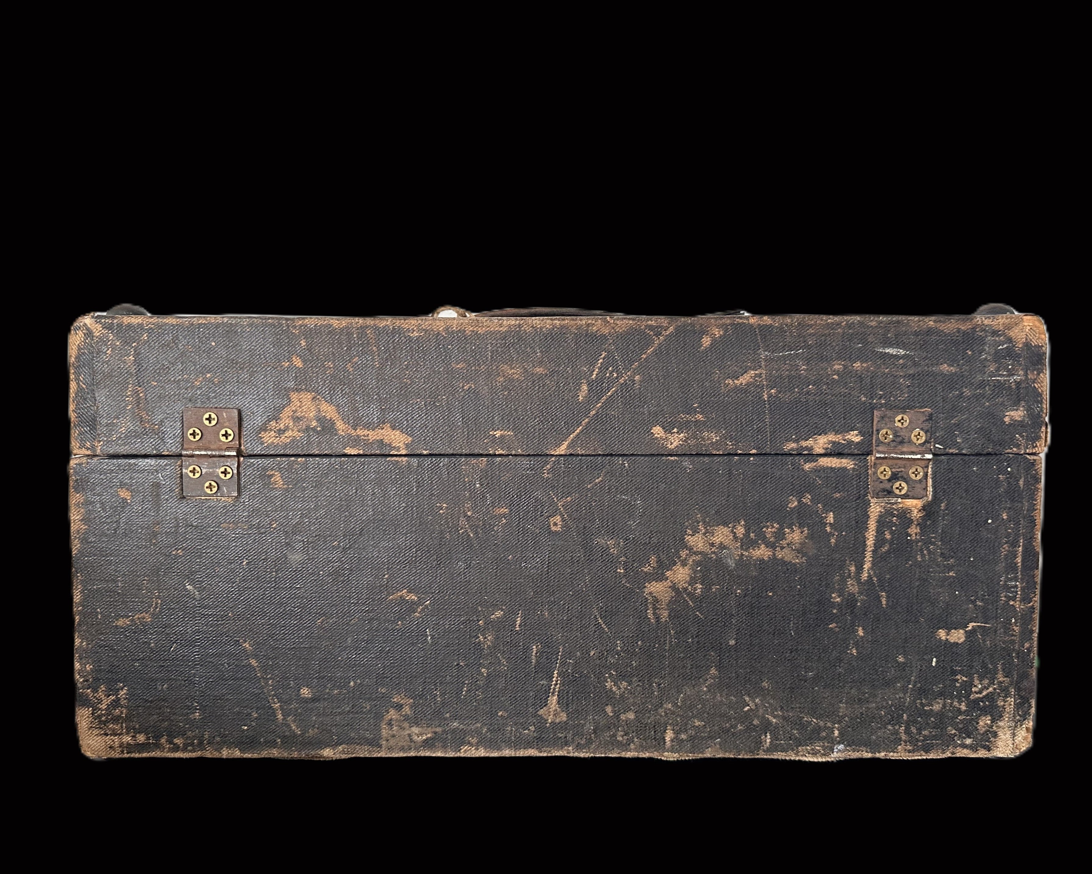 - A heavy black leather transport chest, fitted with brass locks and clasps.