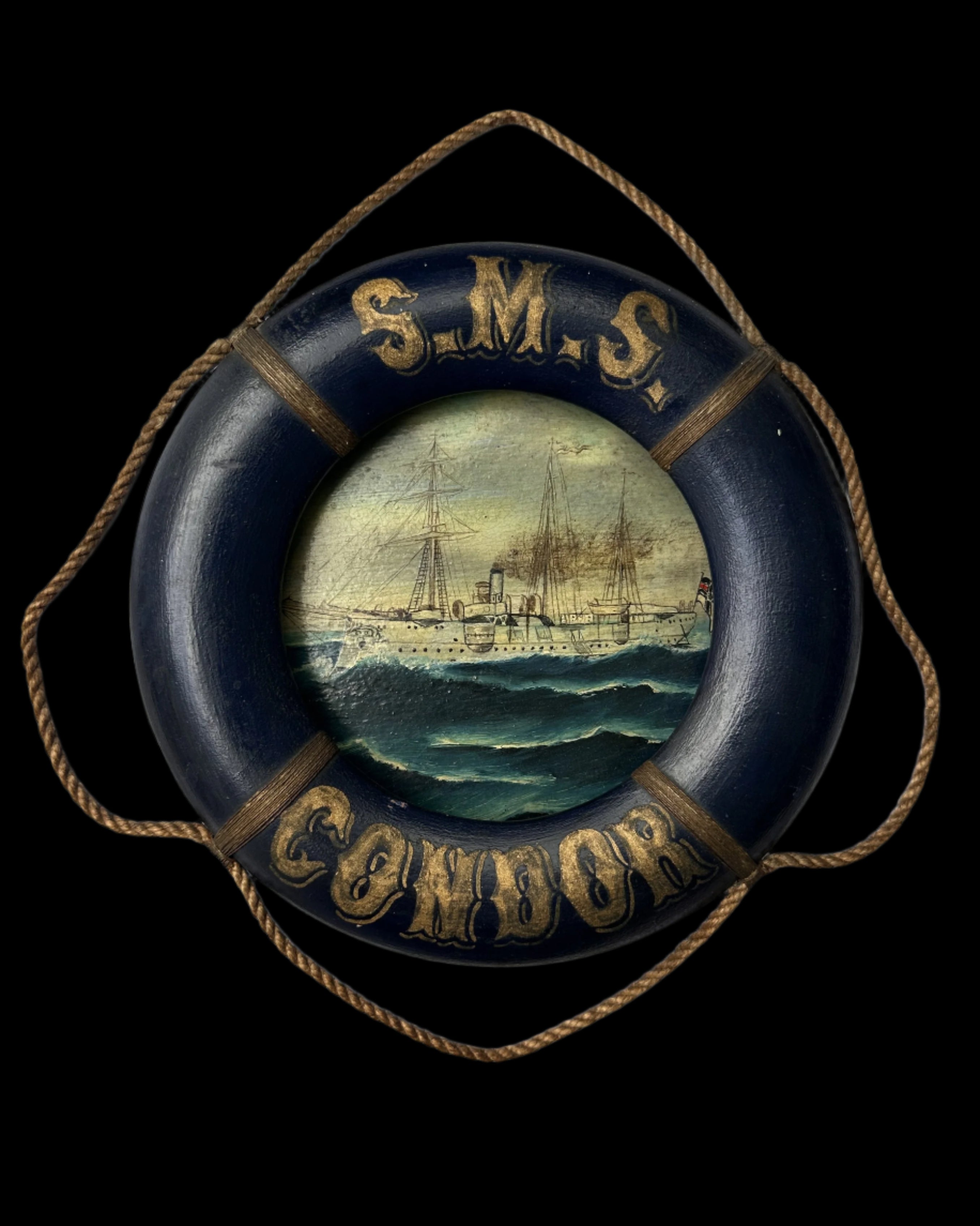 This exceptional and evocative wall display honors the SMS Condor, a Bussard-class unprotected cruiser of the Imperial German Navy launched in 1891. Crafted in the form of a lifebuoy, the circular wooden frame is painted deep navy with four gold-painted rope accents and thick maritime-style cord strung through for hanging. The upper and lower quadrants boldly read “S.M.S.” and “CONDOR” in raised, hand-painted golden lettering.