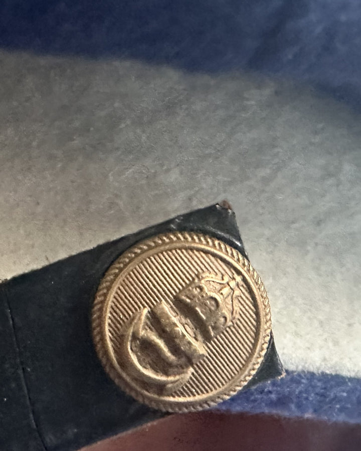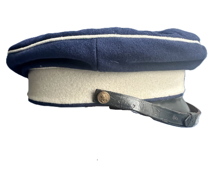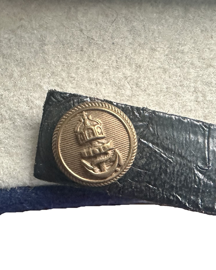 - Unique Features: The brass buttons on the chinstrap feature an embossed crown and anchor design, typical of naval headgear from this period. The wool and felt construction has retained its color, and the cap displays the classic naval style with a slight peak and sturdy construction.