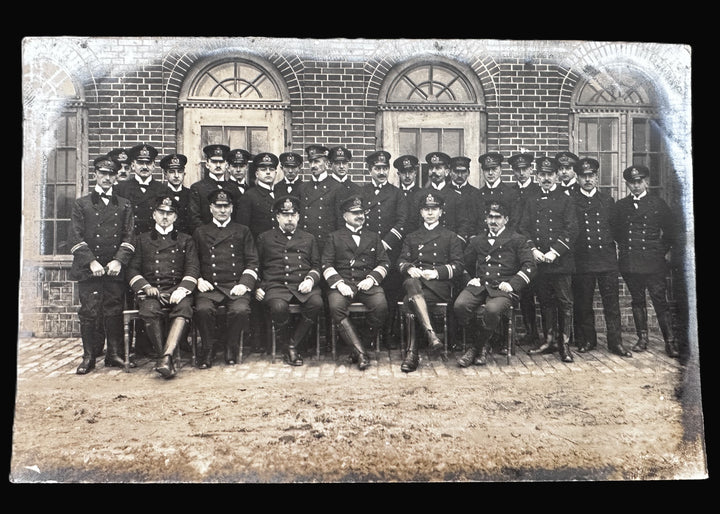 The Imperial German Navy, under the command of Kaiser Wilhelm II, was a symbol of German militarism and ambition during the prelude to World War I. This postcard likely dates to the early 1910s, a time when the German Navy was heavily investing in both personnel and battleships in its naval arms race with Britain. Portraits such as this were commonly commissioned to commemorate important moments, such as promotions, graduations, or anniversaries within a naval unit.