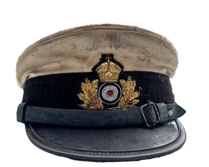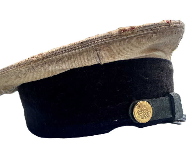 The cap is marked with the correct period stamps and exhibits wear consistent with an original piece from the early 20th century. The combination of the embroidered insignia, materials, and maker’s marks are all indicative of an authentic World War I-era Imperial German Navy officer’s cap.