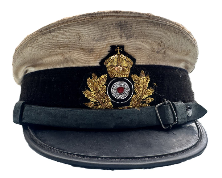 - Insignia: The front displays the gold-embroidered Imperial German Navy insignia, with a large bullion crown atop oak leaves, encircling a cockade with the German national colors (black, white, and red). The embroidery is finely detailed, typical of officer-grade caps from this period.