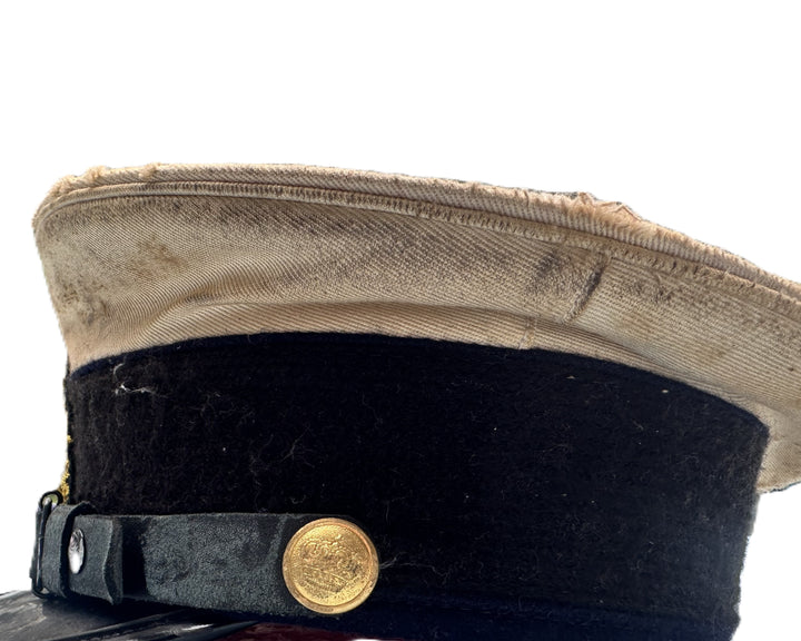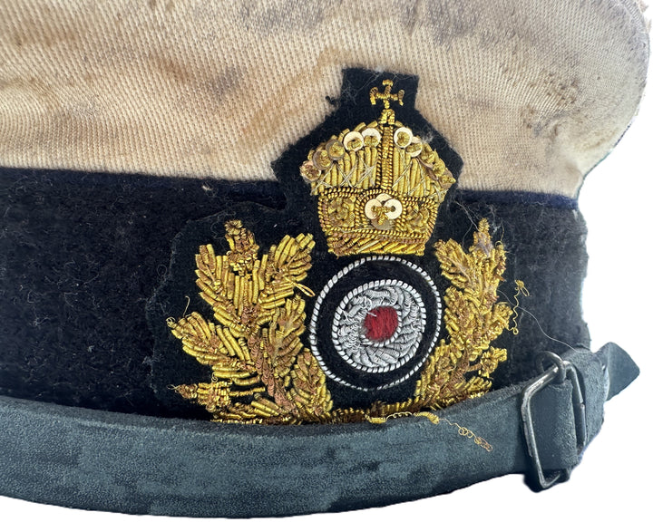 The cap is in fair-to-good condition for its age. The cotton top is worn and stained, likely from active use, but the structure remains intact. The wool band and embroidered insignia are in good condition with minor wear. The interior shows signs of significant use, with the liner showing some wear along the edges. This piece has a historical patina that reflects its age and use.