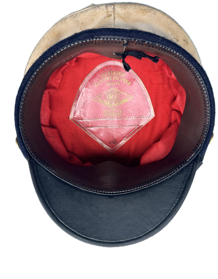 - Interior: The cap’s interior is marked with the maker’s stamp, "Offizier Kleiderkasse Berlin" (Officer’s Clothing Depot, Berlin) and "RV Sonderklasse Extra," indicating this is a higher-grade officer’s cap. The liner is red, showing signs of wear, particularly around the edges, but overall remains in fair condition.