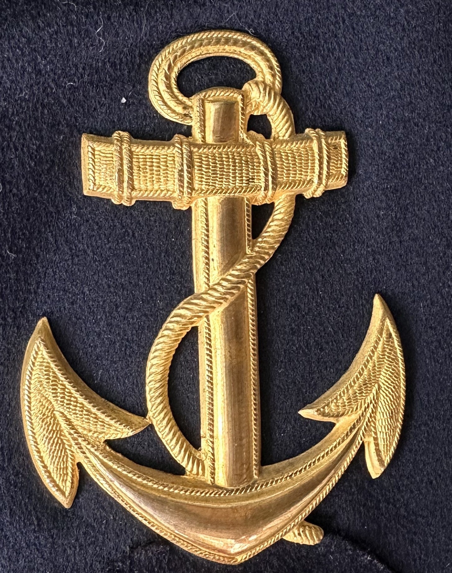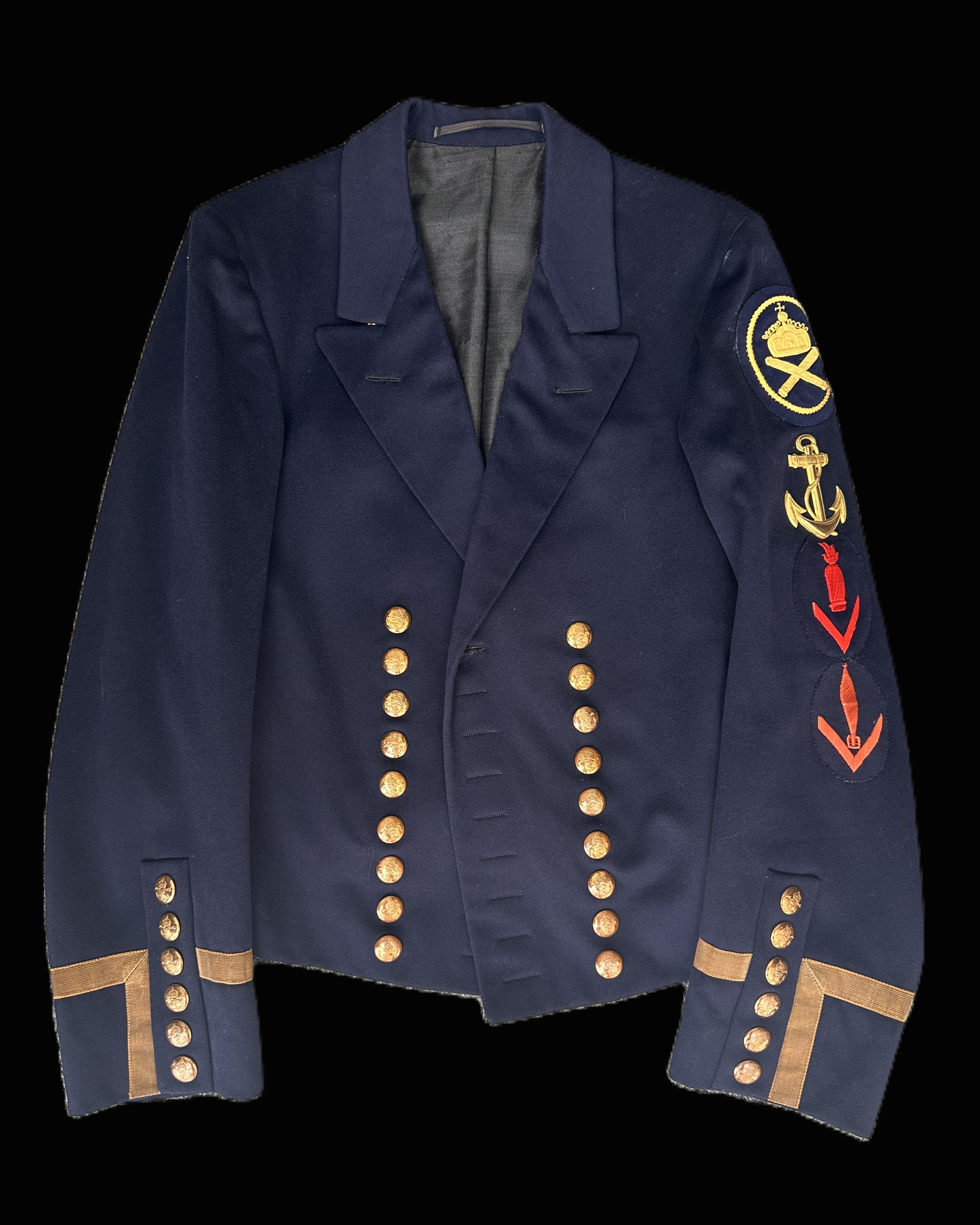 The tunic is constructed from high-quality, deep navy blue wool, fully lined in black, and features a double row of ten gilt anchor buttons, each bearing the Imperial crown and fouled anchor. The cuffs are adorned with gold tresse, denoting NCO or senior enlisted status, and each sleeve is finished with a set of five matching gilt buttons. The left sleeve displays a full set of original insignia: a large gold-embroidered anchor, a flaming grenade, and a torpedo device, all above red chevrons, indicating technical specialty and rank within the torpedo or artillery branch. The upper sleeve patch with crown and crossed batons further suggests a senior technical or warrant officer role. All insignia are period-applied and correct for the era.