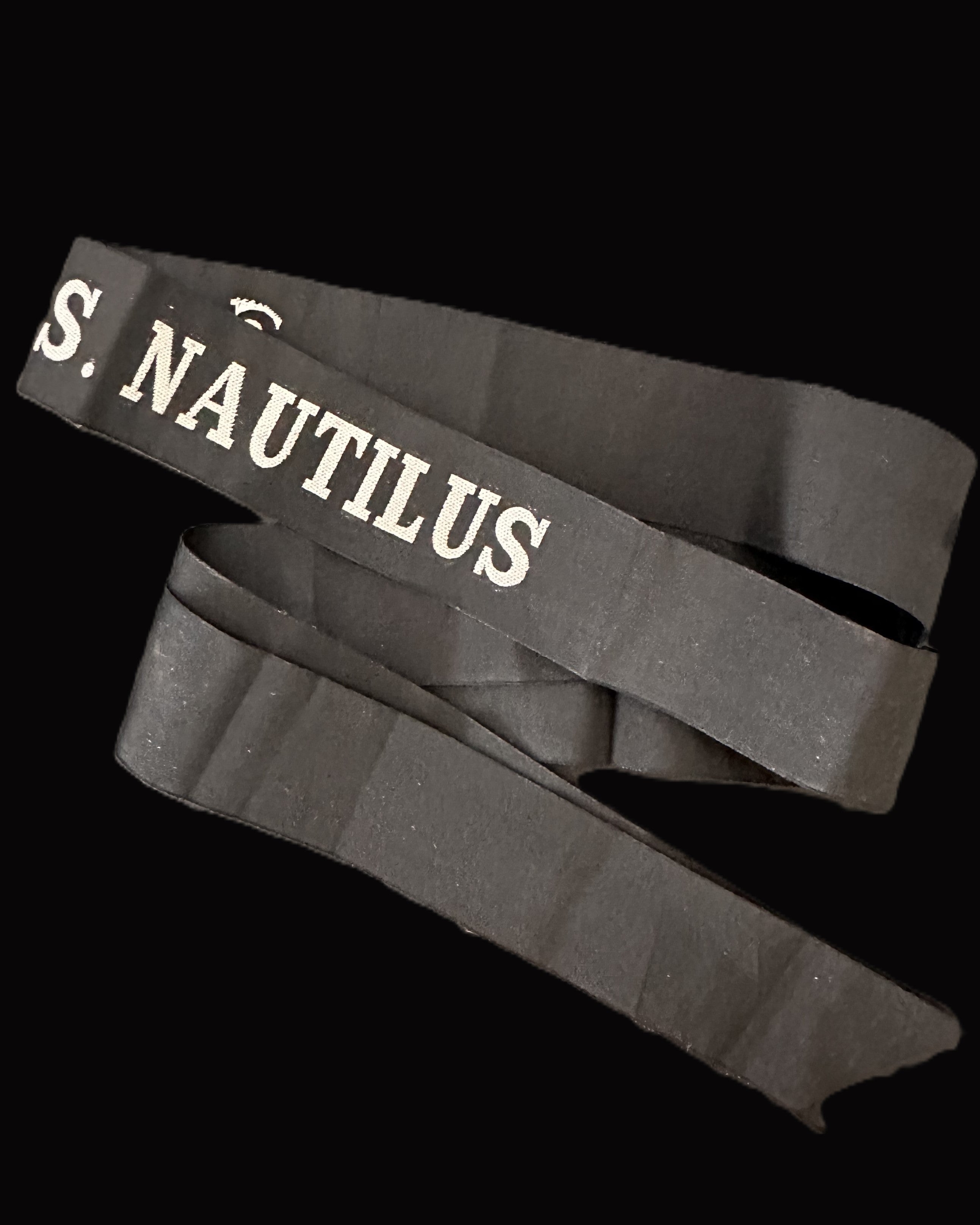 This is a rare and original cap tally from the S.M.S. Nautilus, a vessel of the Imperial German Navy (Kaiserliche Marine). Cap tallies were an essential part of a sailor's uniform, affixed to the traditional navy cap (Tellermütze) and displaying the name of the ship on which they served.