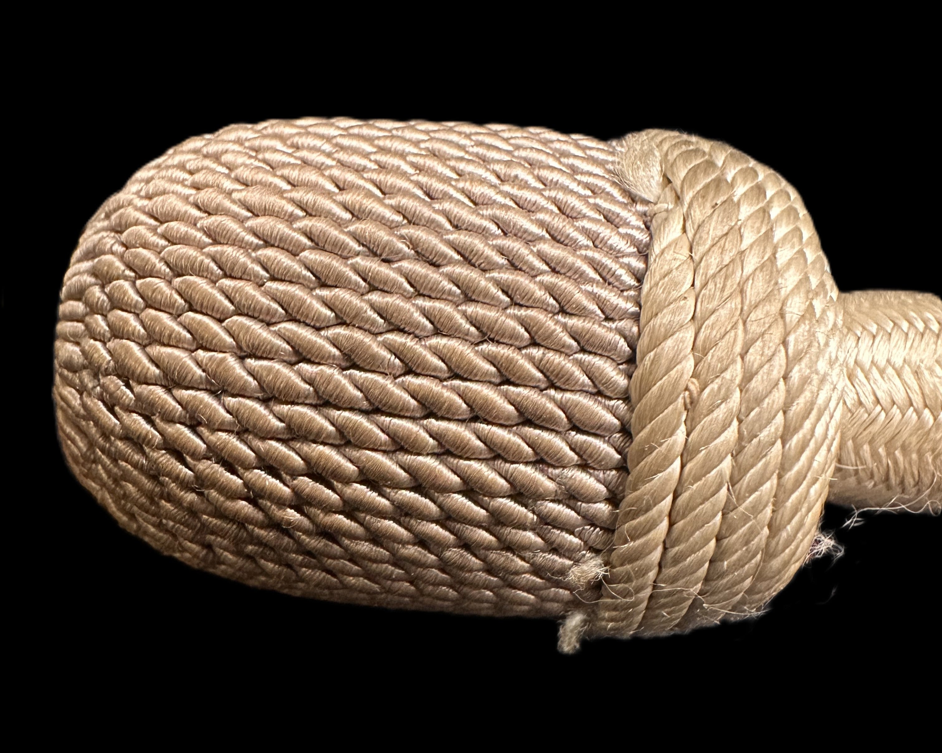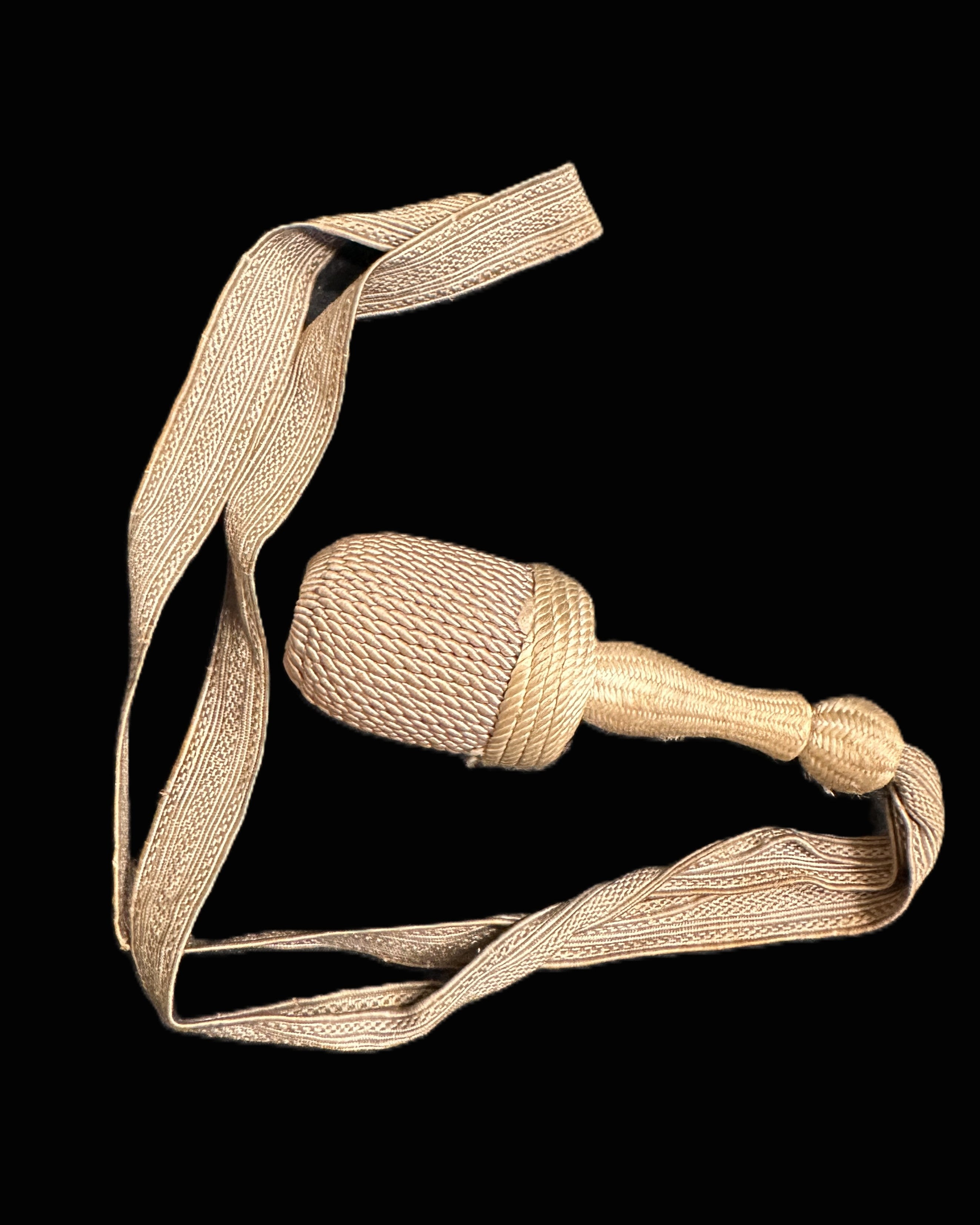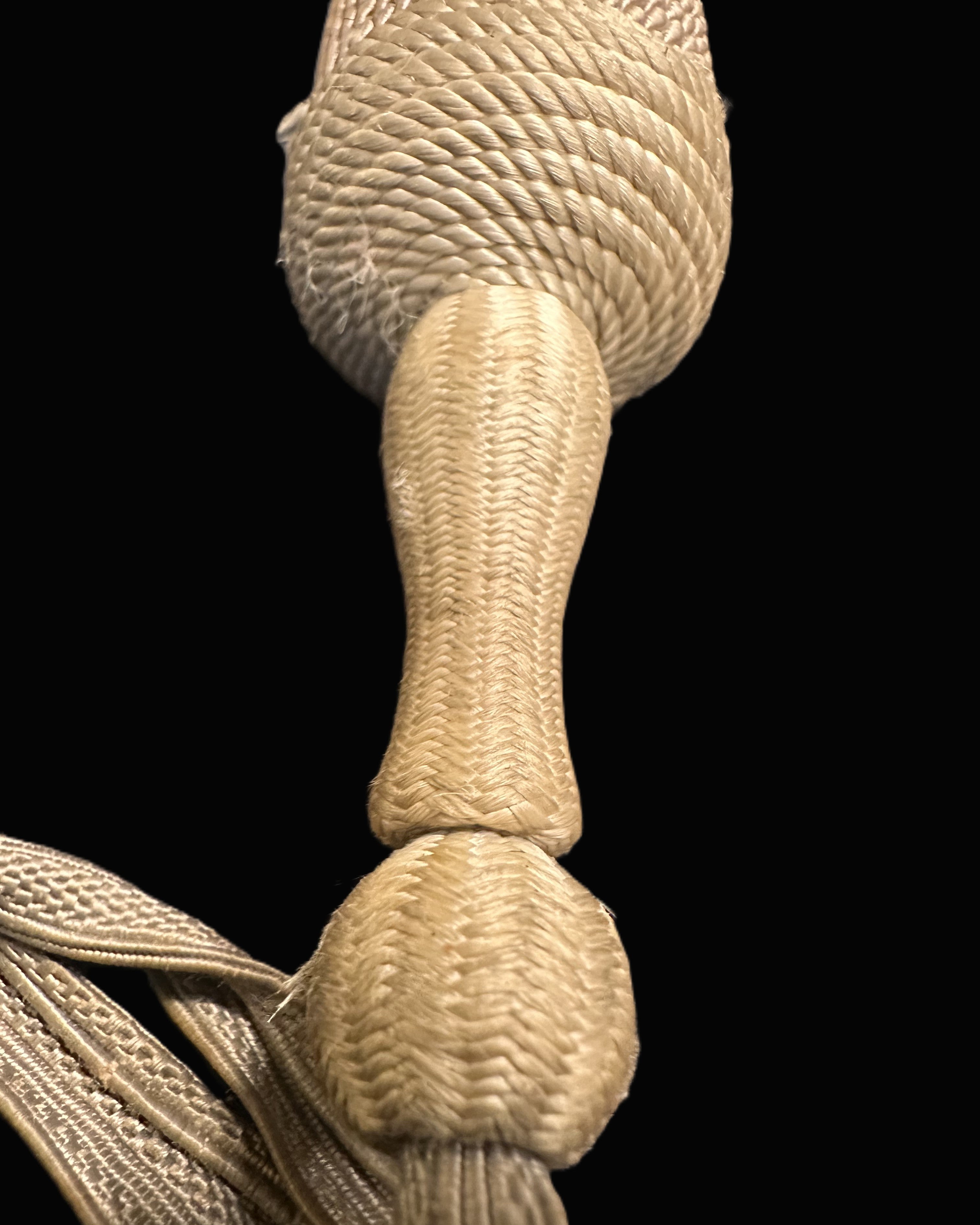 The portepee remains in very good condition for its age, with bullion still intact, no unraveling, and gilt accents still visible. The strap shows mild darkening and light wear consistent with careful use. No fraying is present at the strap’s fold or along the knot’s seam, indicating it was likely removed from a sword long ago and preserved in storage rather than worn in the field.