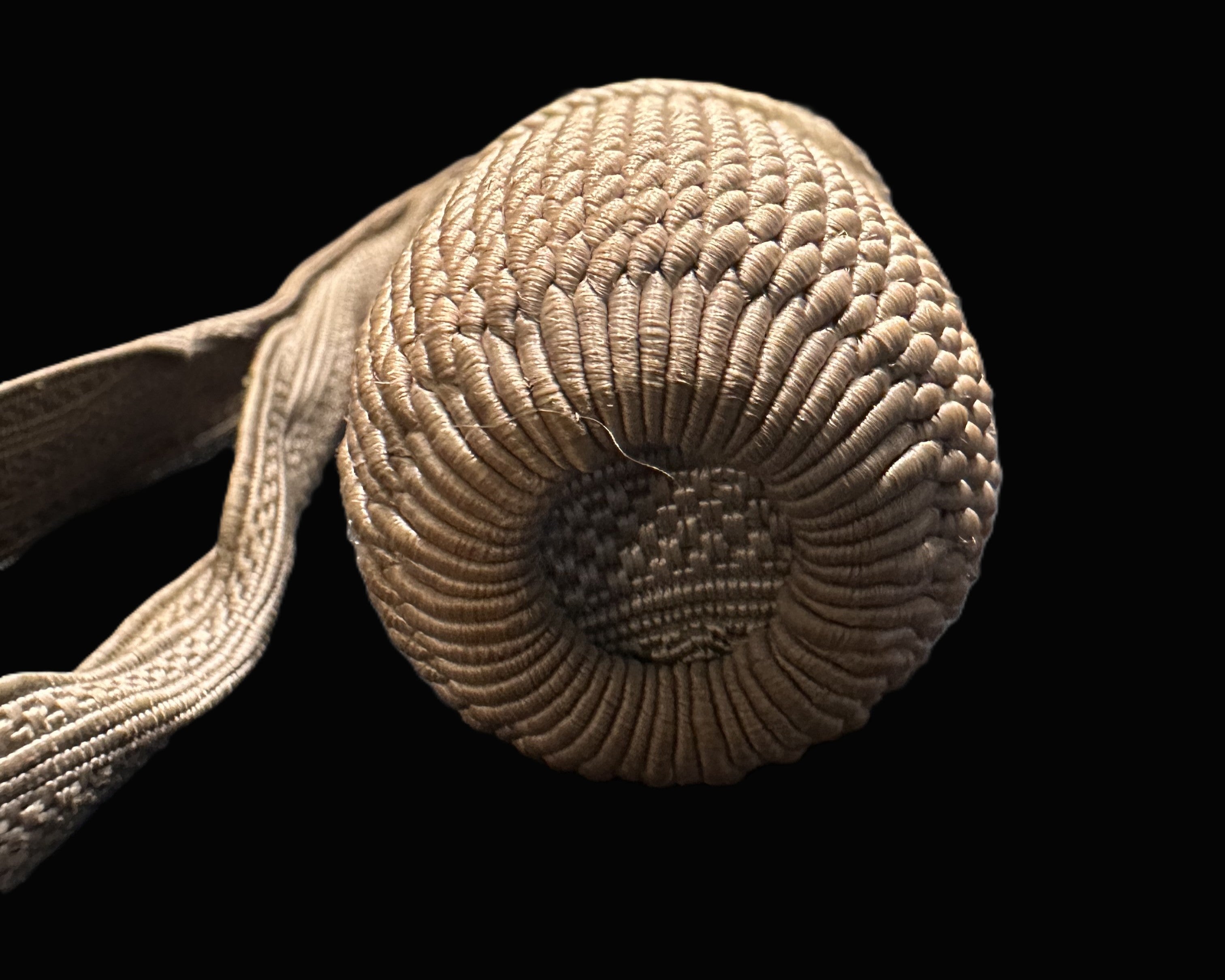 The strap features a tightly woven flat bullion weave, leading to the stem and acorn (Kopf) formed from matching silver bullion with gilt thread interlace. The crown and insert are neatly executed, with the stem’s bullion braiding still tight and the gilt thread retaining its color. The knot ball is firm and well-shaped, showing only minor darkening from age.
