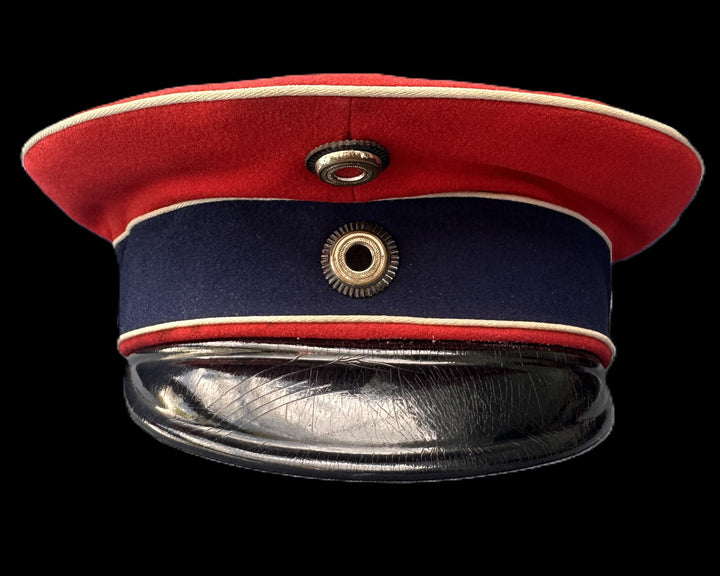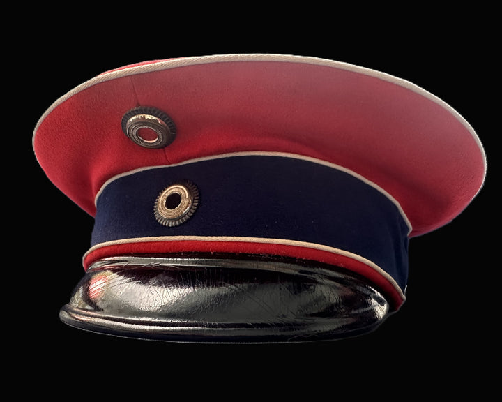 This visor cap is a textbook pre-war example, notable for its medium red (ponceau) wool top, a deep dark blue (black) band, and white piping—colors associated with the regiment. The front bears a single large cockade (kokarde), indicating Prussian service, as well as a smaller Reich cockade, confirming manufacture after the 1897 introduction of the national insignia. The trim and materials are consistent with production around 1898–1900.
