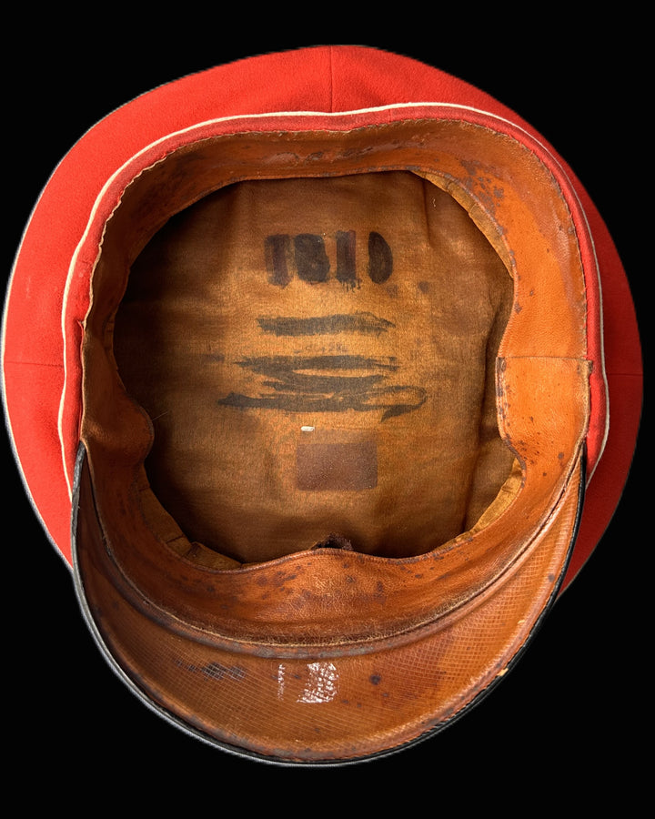 Inside, the visor cap is lined with a brown silk interior and retains its brown leather sweatband. The sweatband is intact and shows moderate soiling, but no tears. The liner exhibits blacked-out script, a common practice either by descendants wishing to preserve a relative’s anonymity, or by museums attempting to depersonalize artifacts for display. The presence of these marks adds a layer of mystery and authenticity.