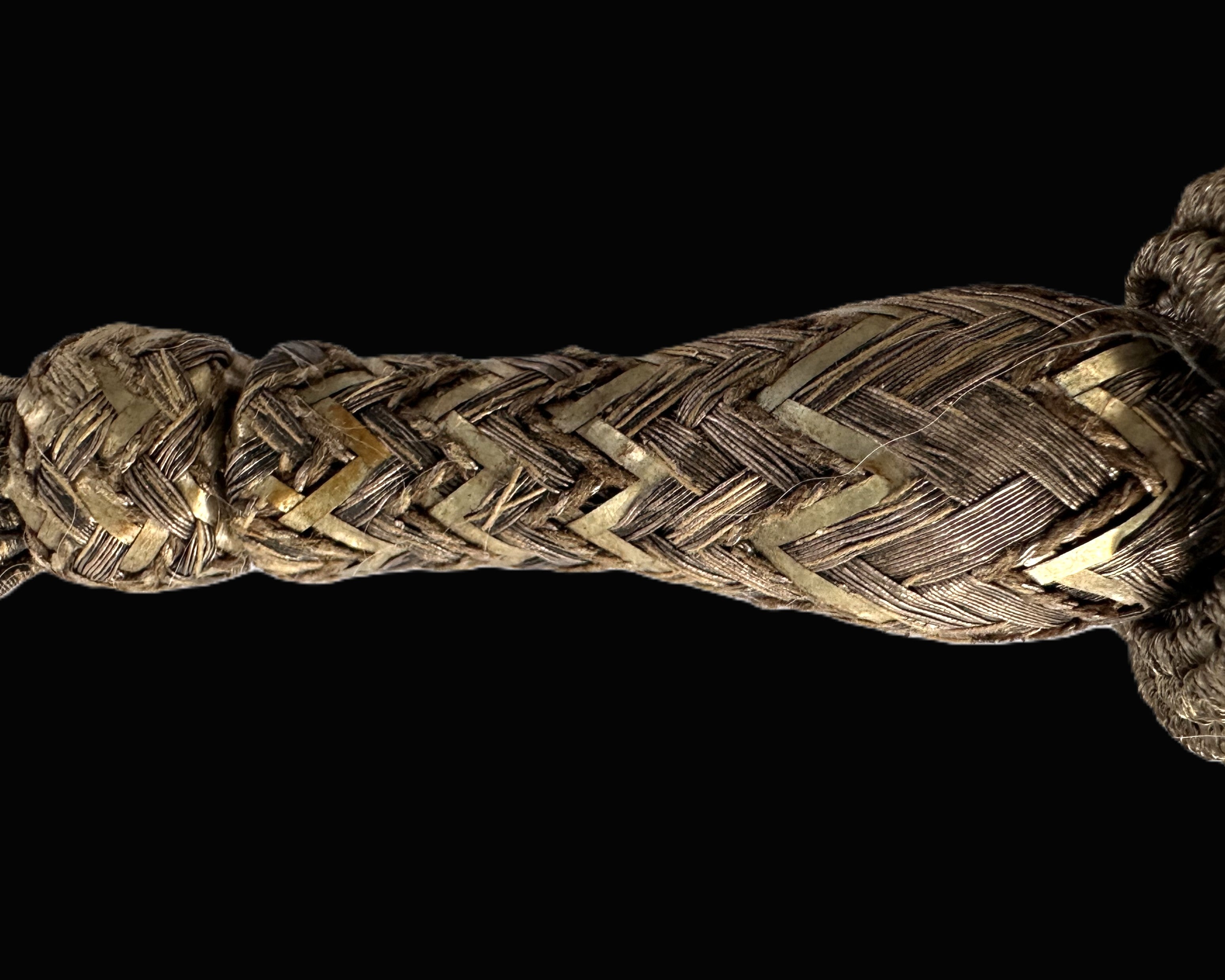 The sword knot displays the classic looped strap, reinforced and sewn at the neck for attaching to the hilt. It remains structurally sound with a tightly braided stem and beautifully dense silver bullion wrap, showcasing exceptional craftsmanship. These knots were more than decoration; they served as regimental distinctions, and in some cases, carried encoded rank or unit information depending on the color and weave.