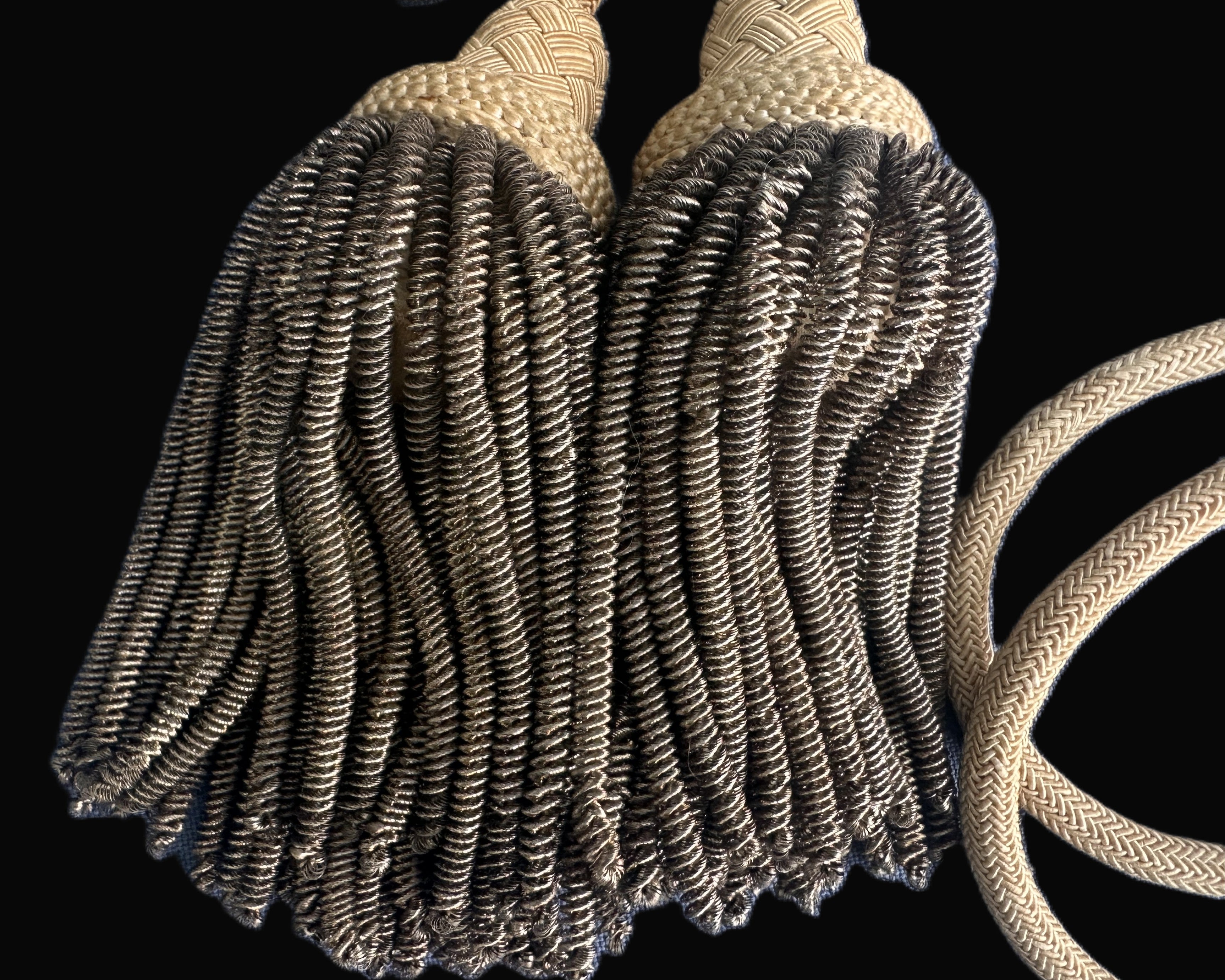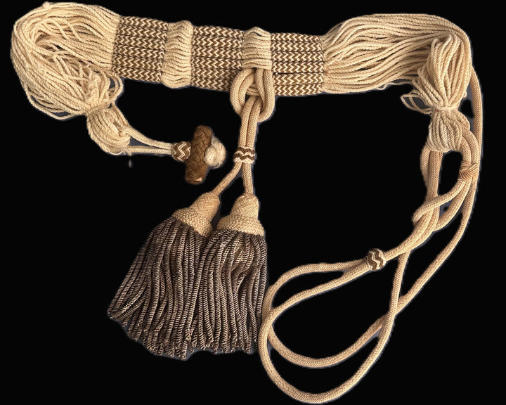 The sash remains in very fine condition, with vibrant coloration to the threads and fully intact bullion tassels. The cord loops are supple and undamaged. Light fraying is visible in one knot and around the edges of the identification label, consistent with careful storage and light use. The sash is structurally solid, with no unraveling or excessive fading.