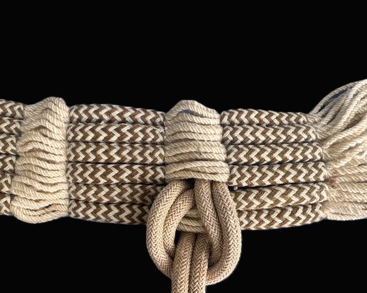 This exceptionally preserved Imperial German officer’s waist sash (Offizier-Feldbinde) is a striking artifact of ceremonial military dress, featuring exquisite craftsmanship and direct provenance to a named non-commissioned officer. Constructed from interwoven cords of ivory and brown silk thread, the sash culminates in a pair of large, heavy bullion tassels — a hallmark of Imperial cavalry dress. The weave exhibits both zigzag and herringbone patterns, showcasing the refined detail expected from high-ranking regimental regalia.