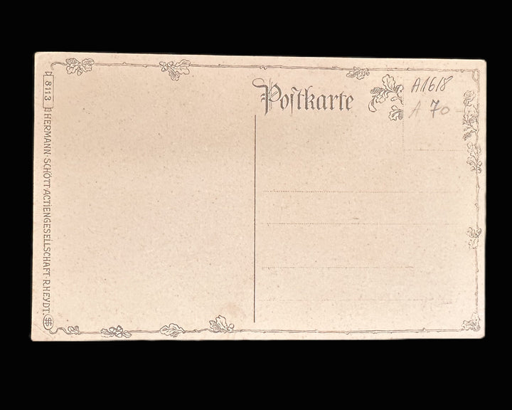 The artwork is printed on light cream card stock with a smooth surface, showing scattered age spotting and light foxing consistent with early 20th-century paper. The reverse is a standard divided-back “Postkarte” format with decorative floral border elements and printed publisher information reading “Hermann Schött A.G., Aktiengesellschaft, Rheydt,” a known German publisher of illustrated postcards during the Imperial period. The card is unused, with no writing or postal markings, preserving the full clarity of the image and typography.