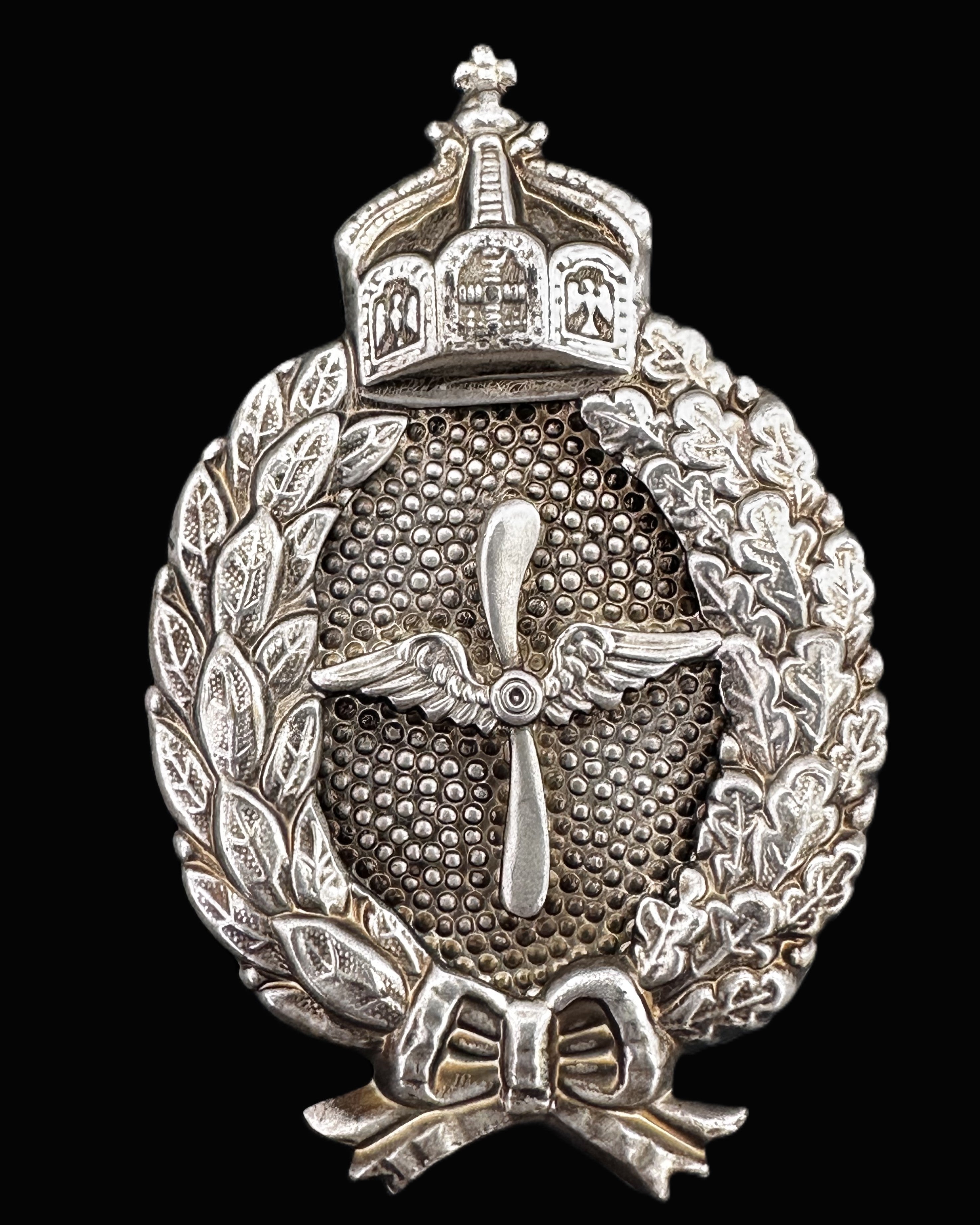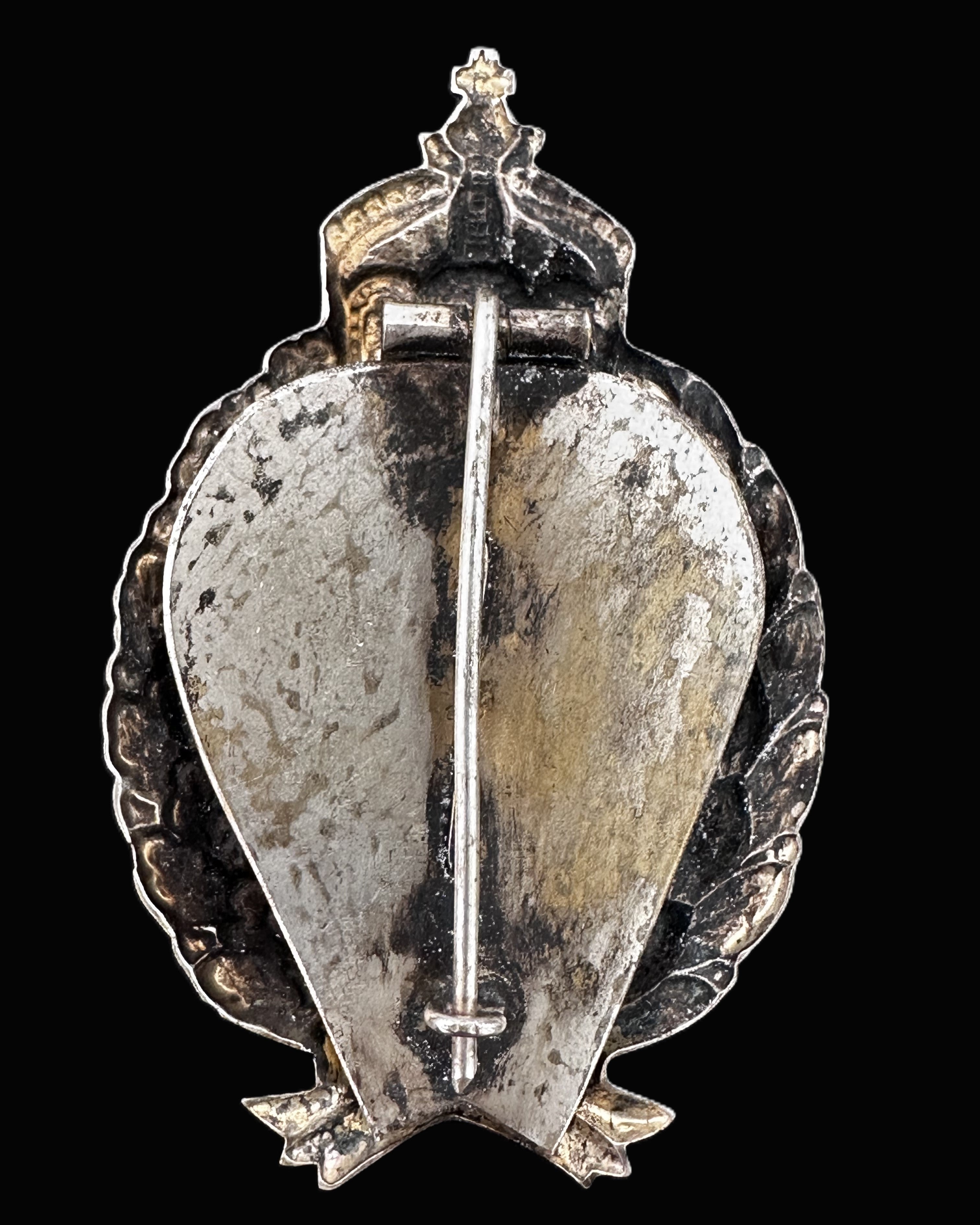 This badge is in excellent condition, with crisp details on the laurel and oak leaves, as well as on the propeller and wings. The silver has been well-preserved, with only light tarnish that enhances its antique charm. The pin and clasp mechanism remain fully operational.