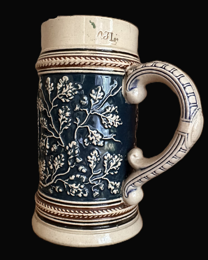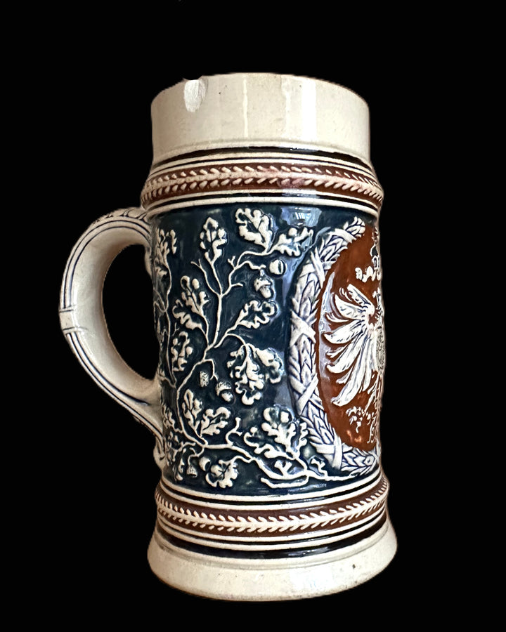 This richly detailed Imperial German beer stein embodies the craftsmanship and patriotic symbolism of late 19th to early 20th century Germany. The stein is molded from stoneware in a traditional cylindrical form, finished in deep cobalt blue, earthy brown, and ivory glazes.