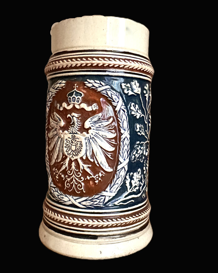 These types of steins were often produced for patriotic civilians or veterans' organizations in the years leading up to WWI. The use of the crowned double-headed eagle places its origin in the Kaiserreich era (1871–1918).