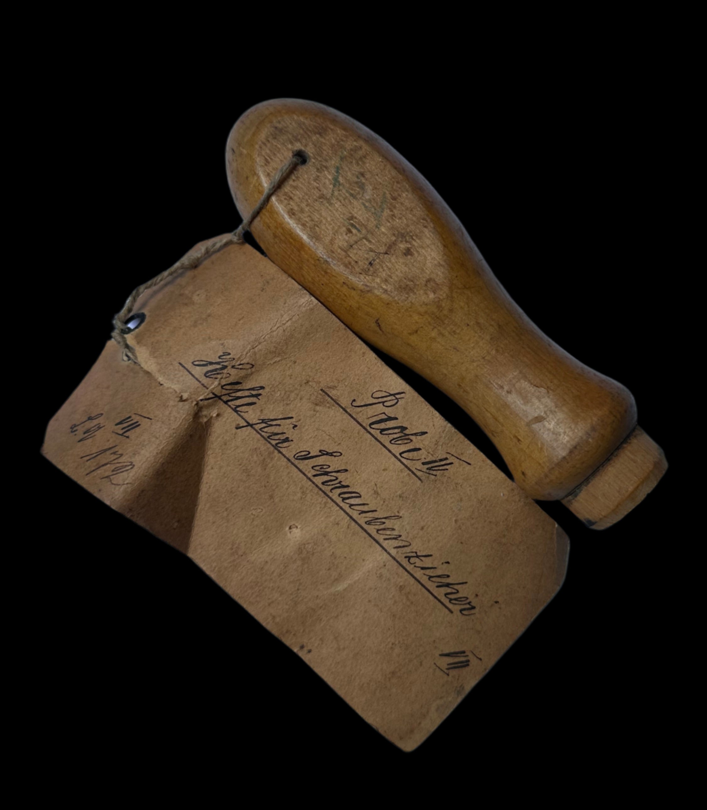 The tool itself is modest, suggesting it was submitted for design review, ergonomic testing, or prototype approval—common practice in military arsenals when producing standardized equipment across the empire's technical branches. The accompanying handwritten note and intact wax seal elevate it beyond an ordinary handle, turning it into a documented piece of military-industrial process history from the height of the Kaiserreich's naval buildup.