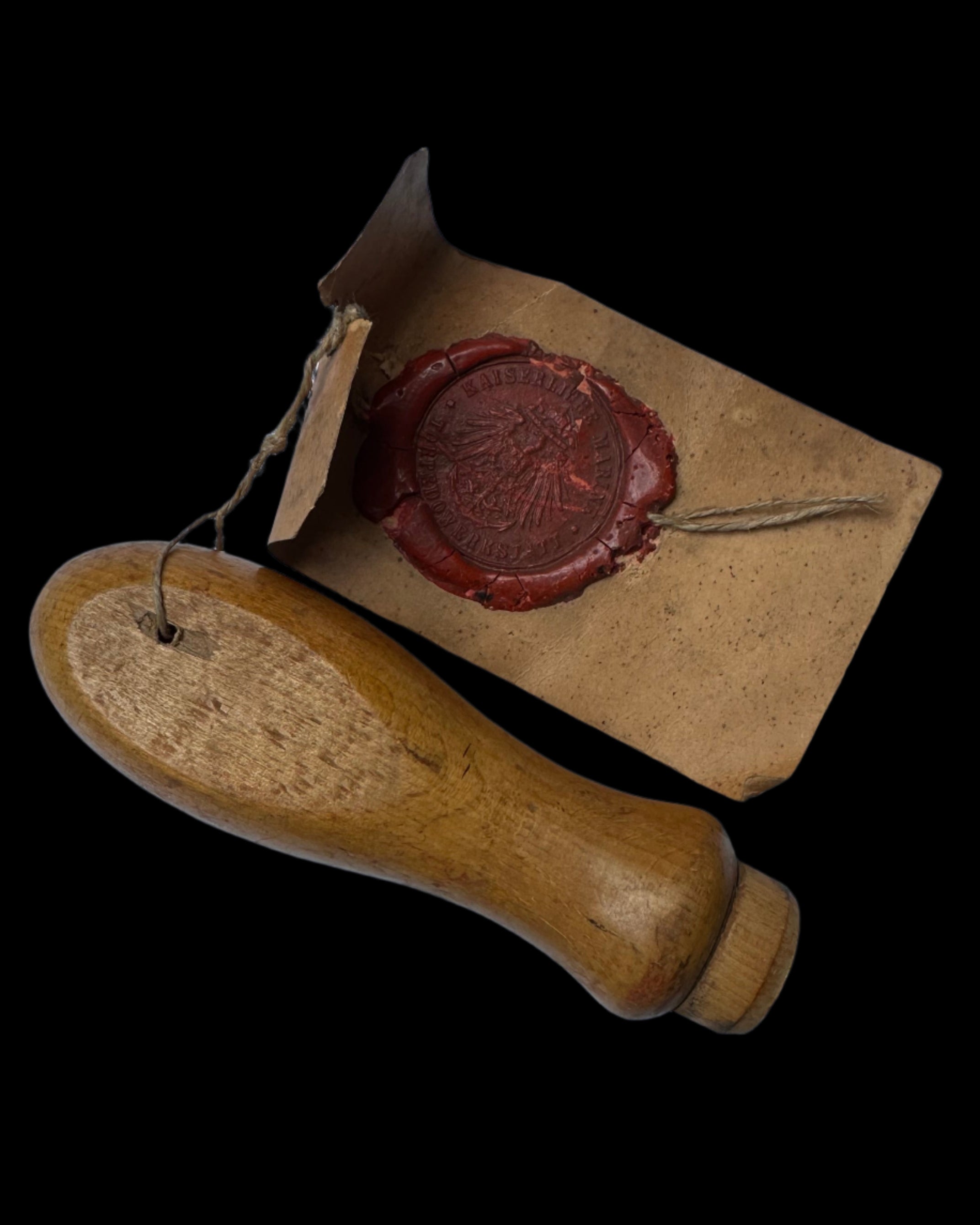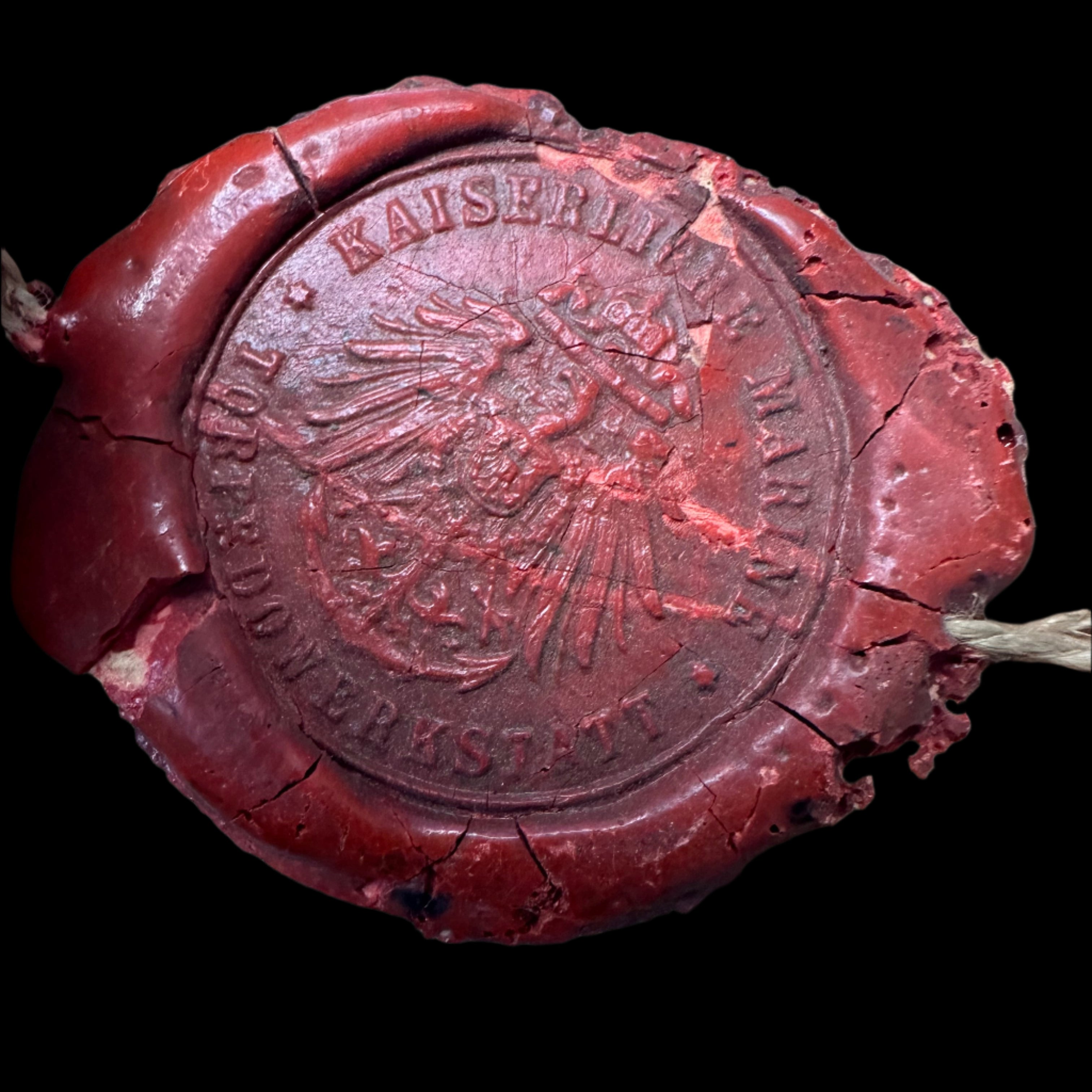 The tag is dated 28. VII. 1912, firmly placing this item in the pre-World War I era. Most significantly, affixed to the reverse of the tag is an impressively preserved red wax seal, deeply stamped with the imperial crest of the Kaiserliche Marine (Imperial German Navy). The circular legend reads: